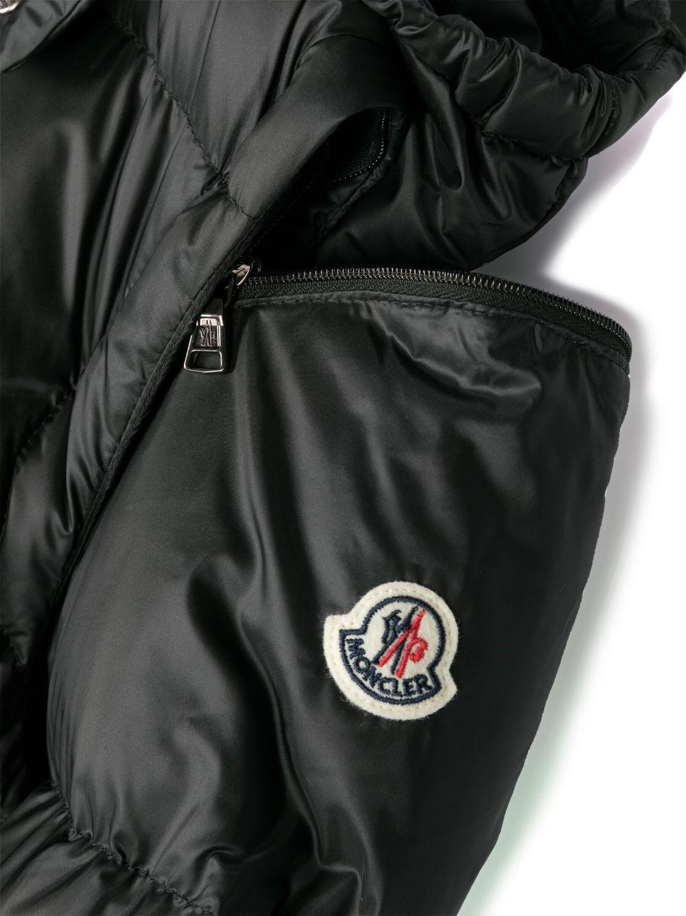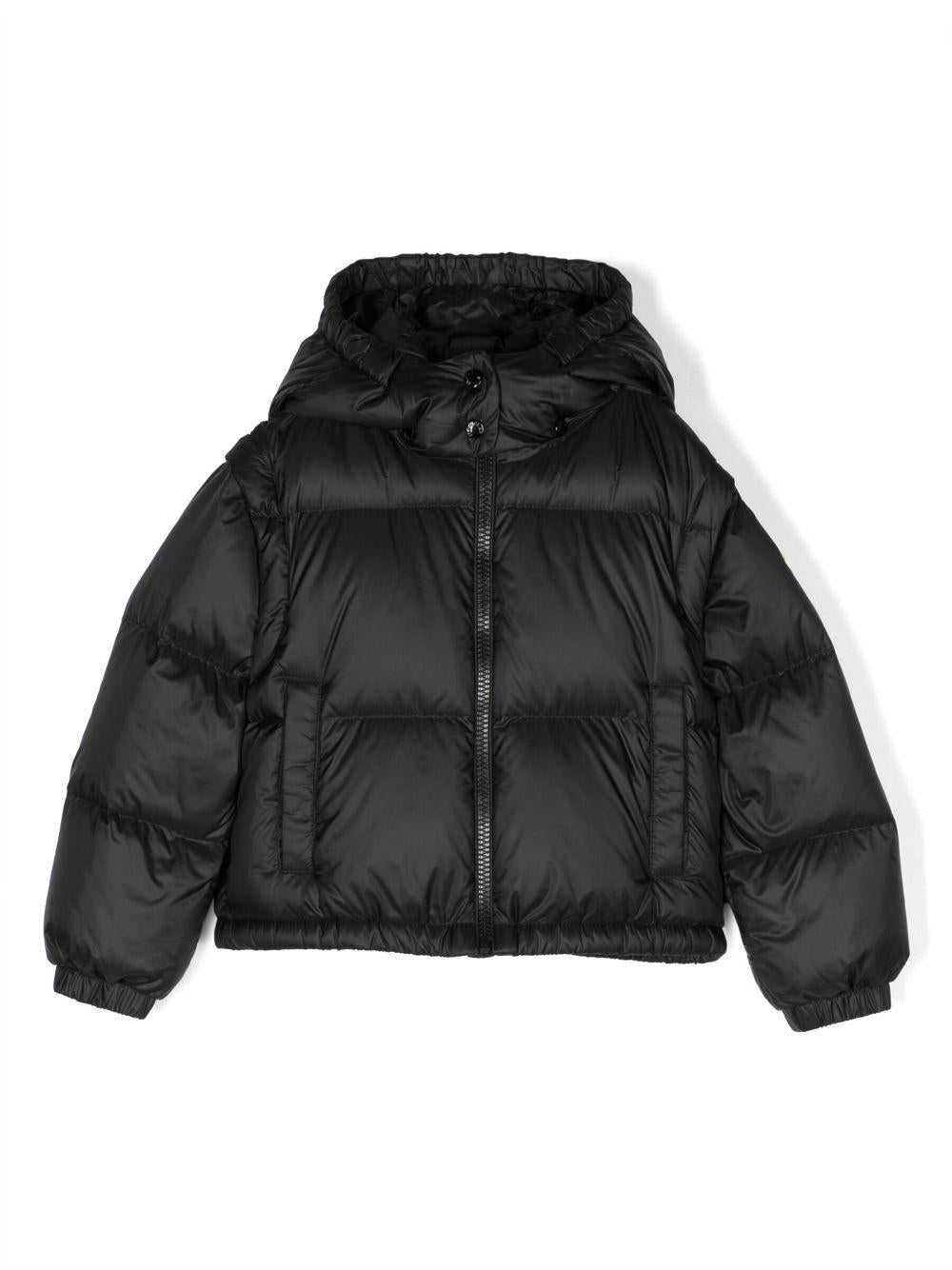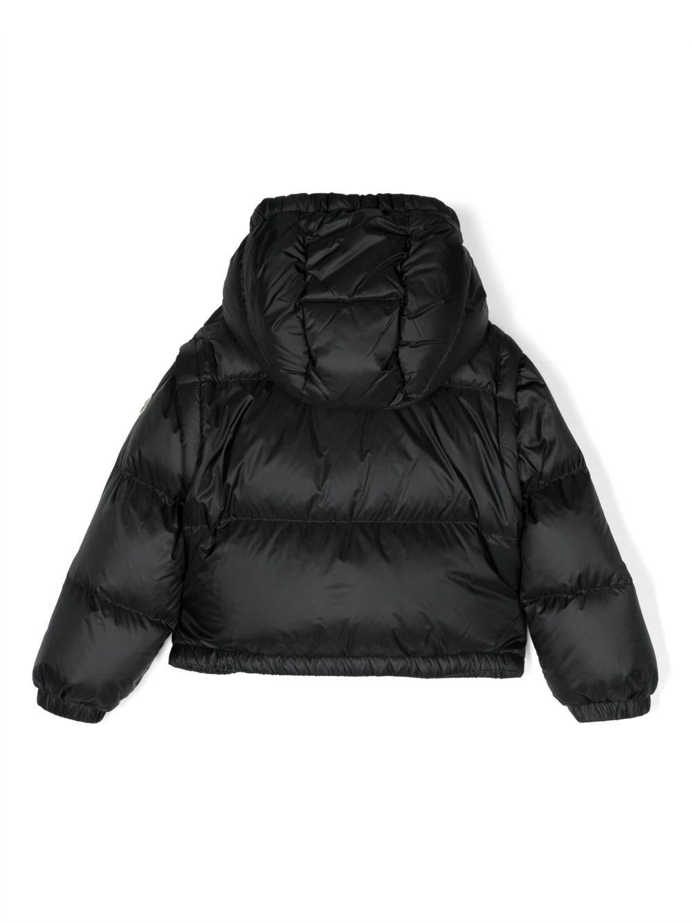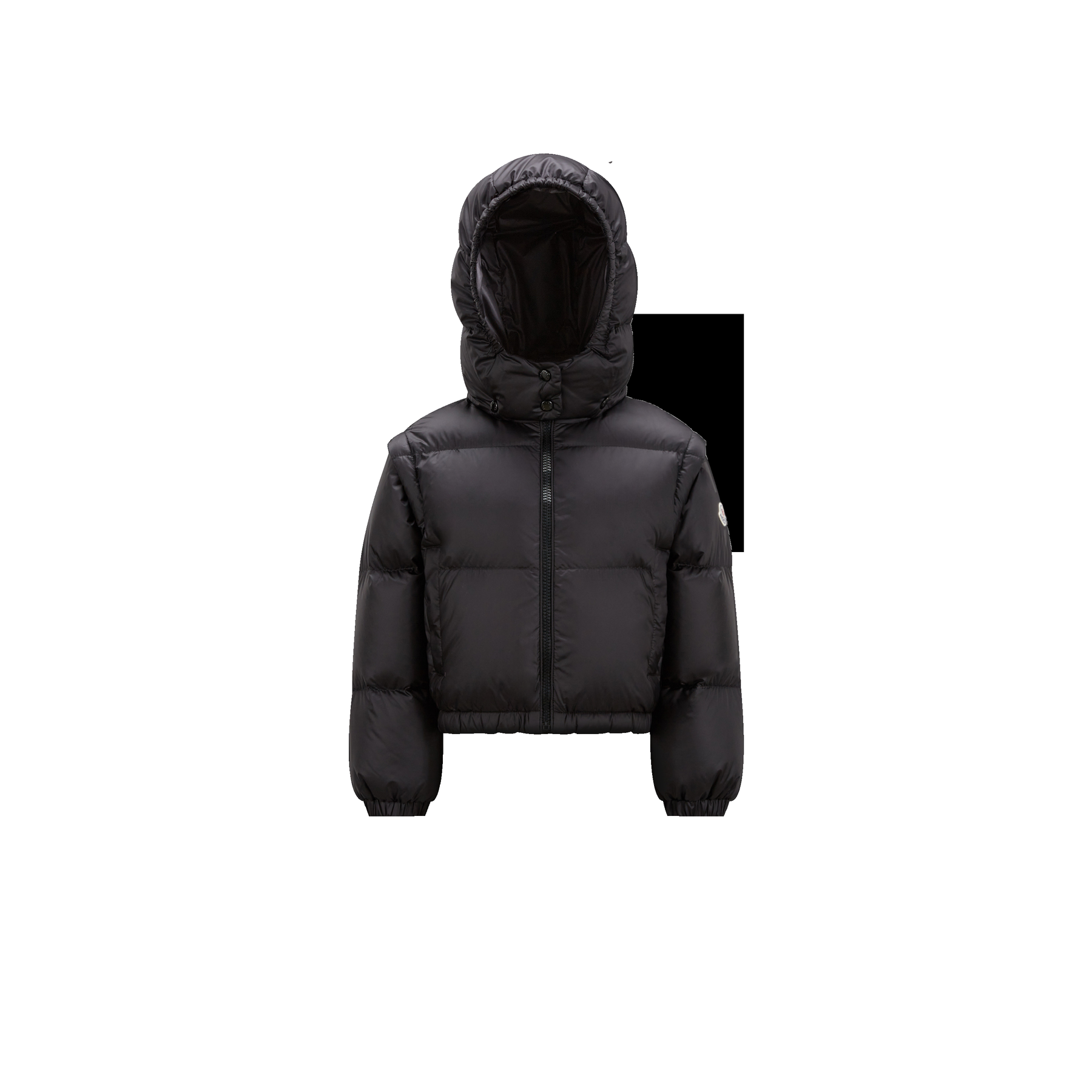 Giubbotto nero bambina con logo, Moncler kids, design imbottito, applicazione sulla manica con logo, colletto con bottoni a pressione, chiusura frontale con zip, maniche rimovibili, due tasche a filetto laterali, polsini elasticizzati e orlo elasticizzato.ComposizioneEsterno: Poliammide 100%Fodera: Piuma D'oca 100%, Poliammide 100%