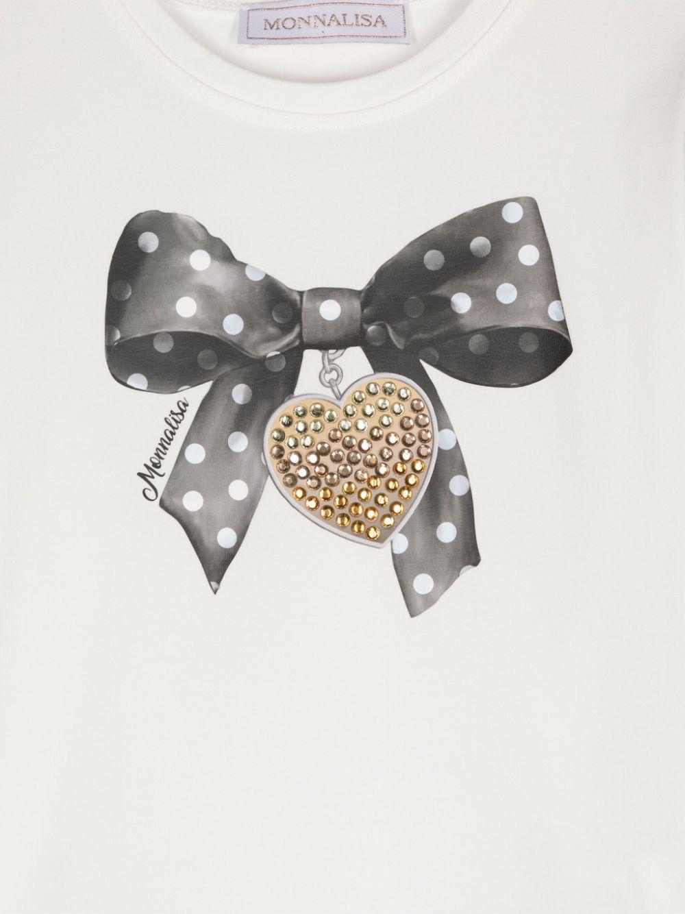 T-shirt bianca bambina Monnalisa kids. jersey leggero, decorazione con strass, stampa con fiocco, stampa con logo sul davanti, girocollo, maniche lunghe e orlo dritto. cotone 100%