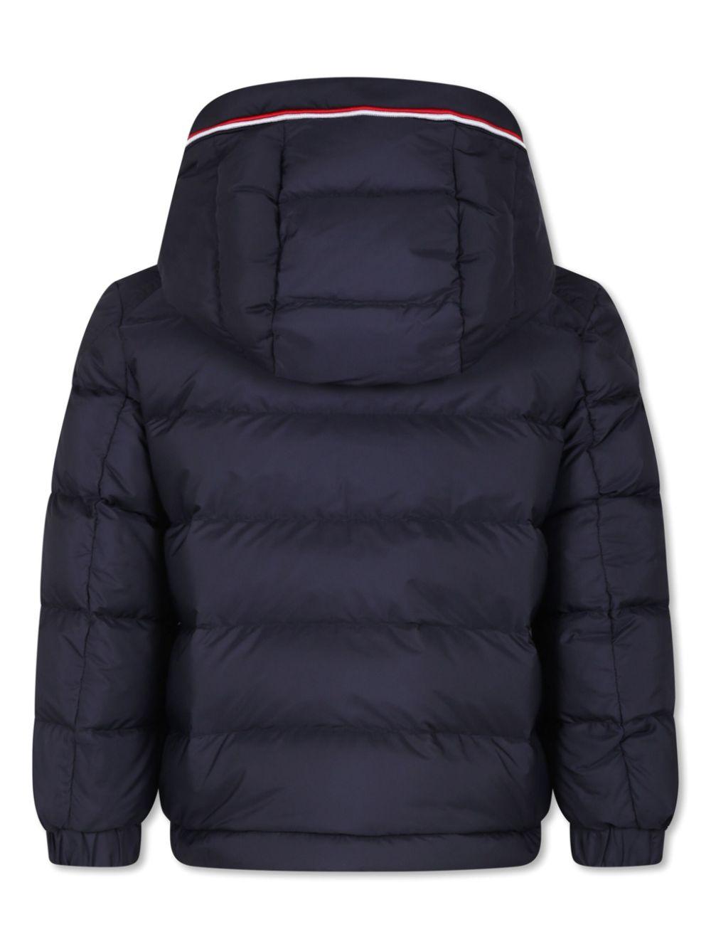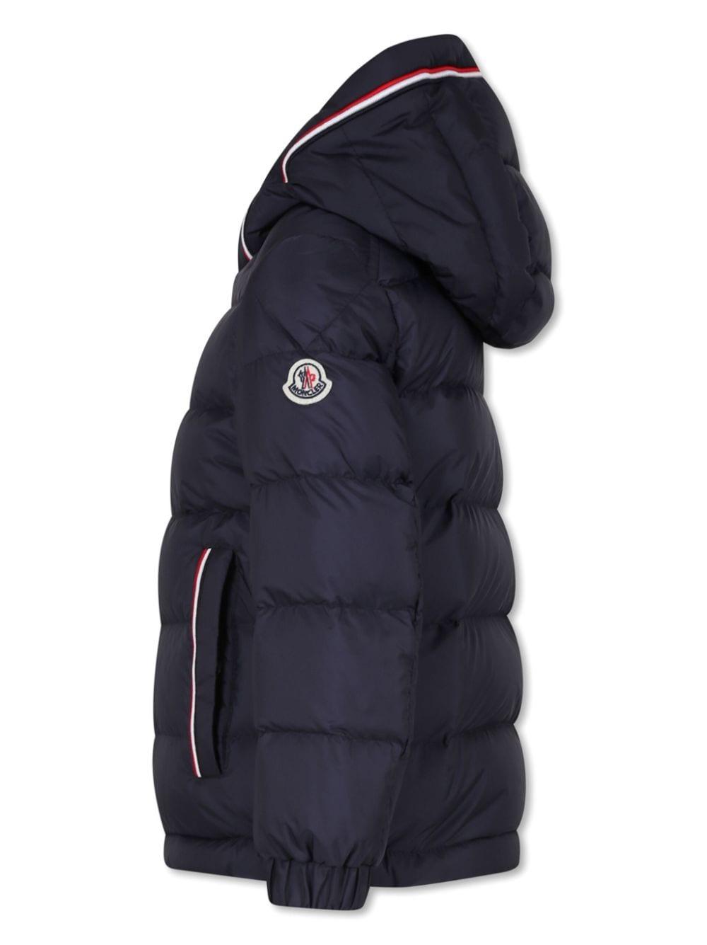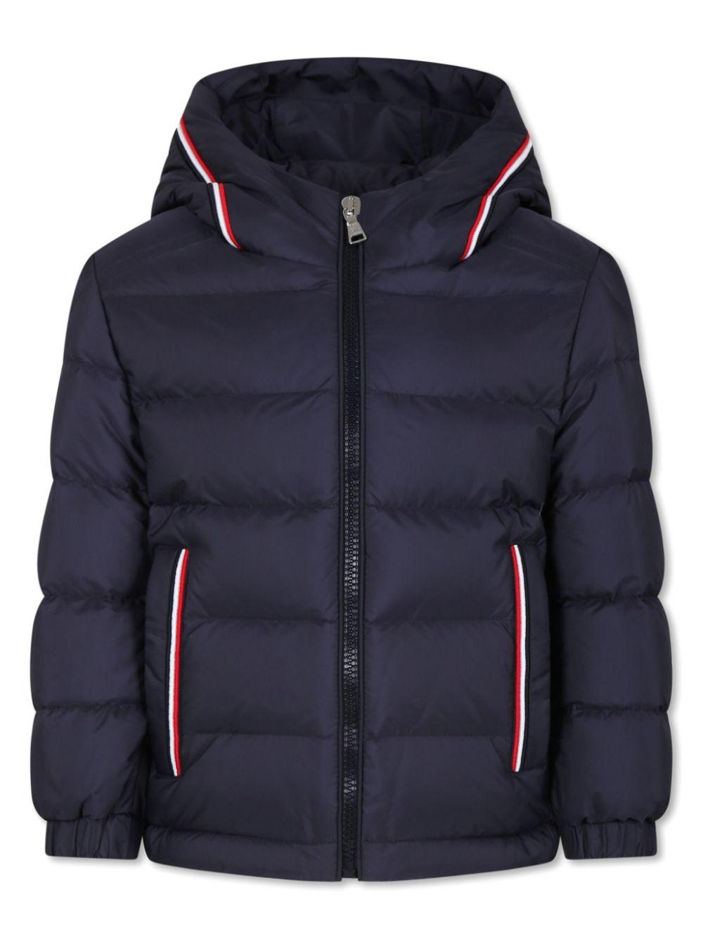 Piumino blu navy bambino Moncler kids. Design imbottito, dettaglio a righe, applicazione sulla manica con logo, cappuccio, chiusura frontale con zip, due tasche laterali a filetto, maniche lunghe e orlo dritto. poliestere 100%