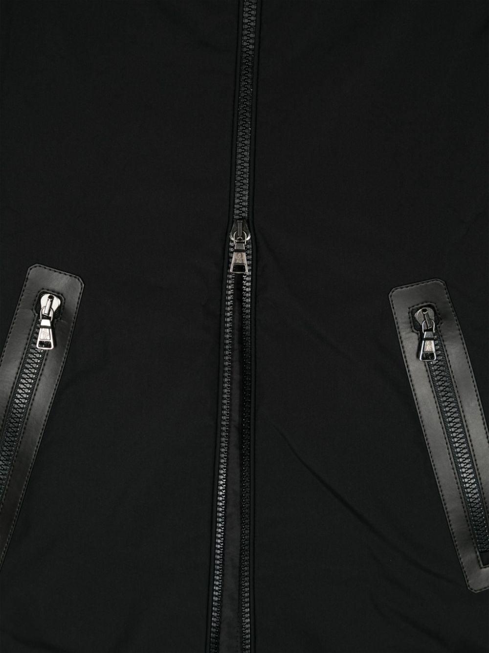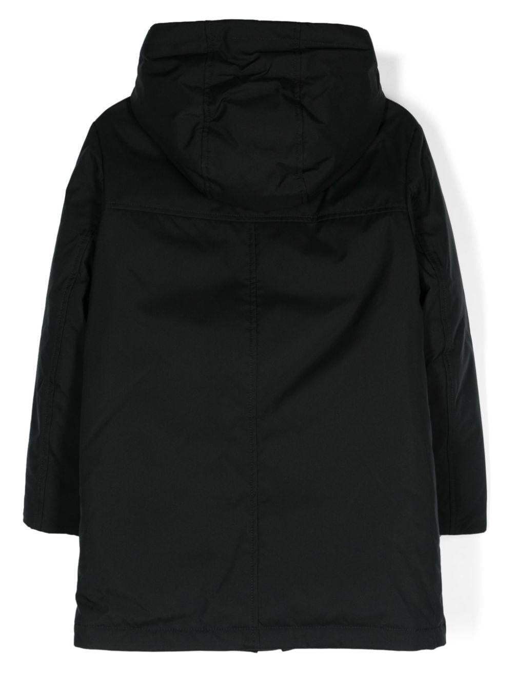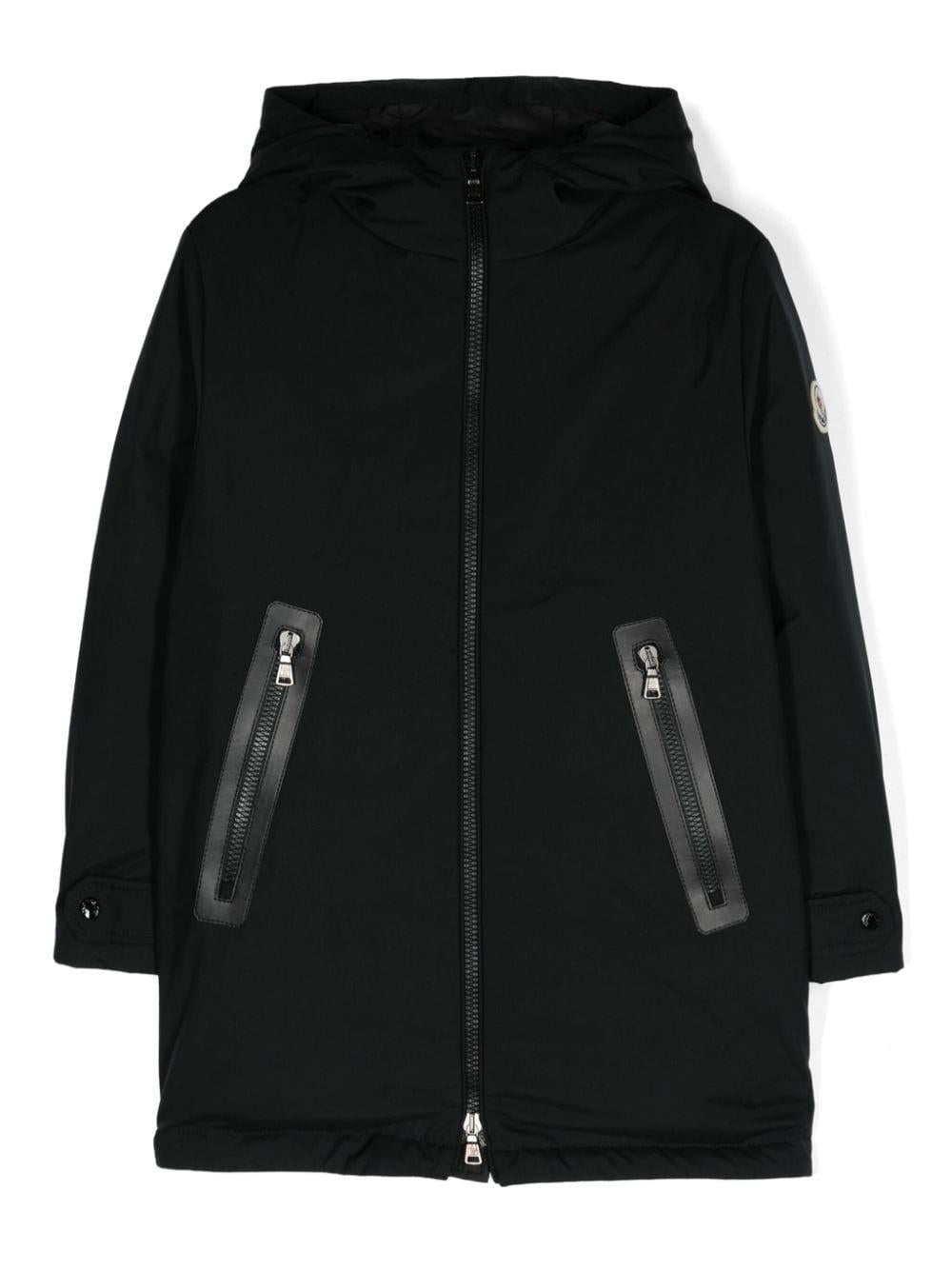 Piumino nero bambino Moncler kids. Design imbottito, imbottitura in piuma d'oca, cappuccio, collo a imbuto, maniche lunghe, applicazione sulla manica con logo, polsini con abbottonatura a pressione, due tasche laterali con zip, orlo dritto, chiusura frontale con zip a doppio cursore. poliestere 100%, piuma d'oca 90%, piuma d'oca 10%