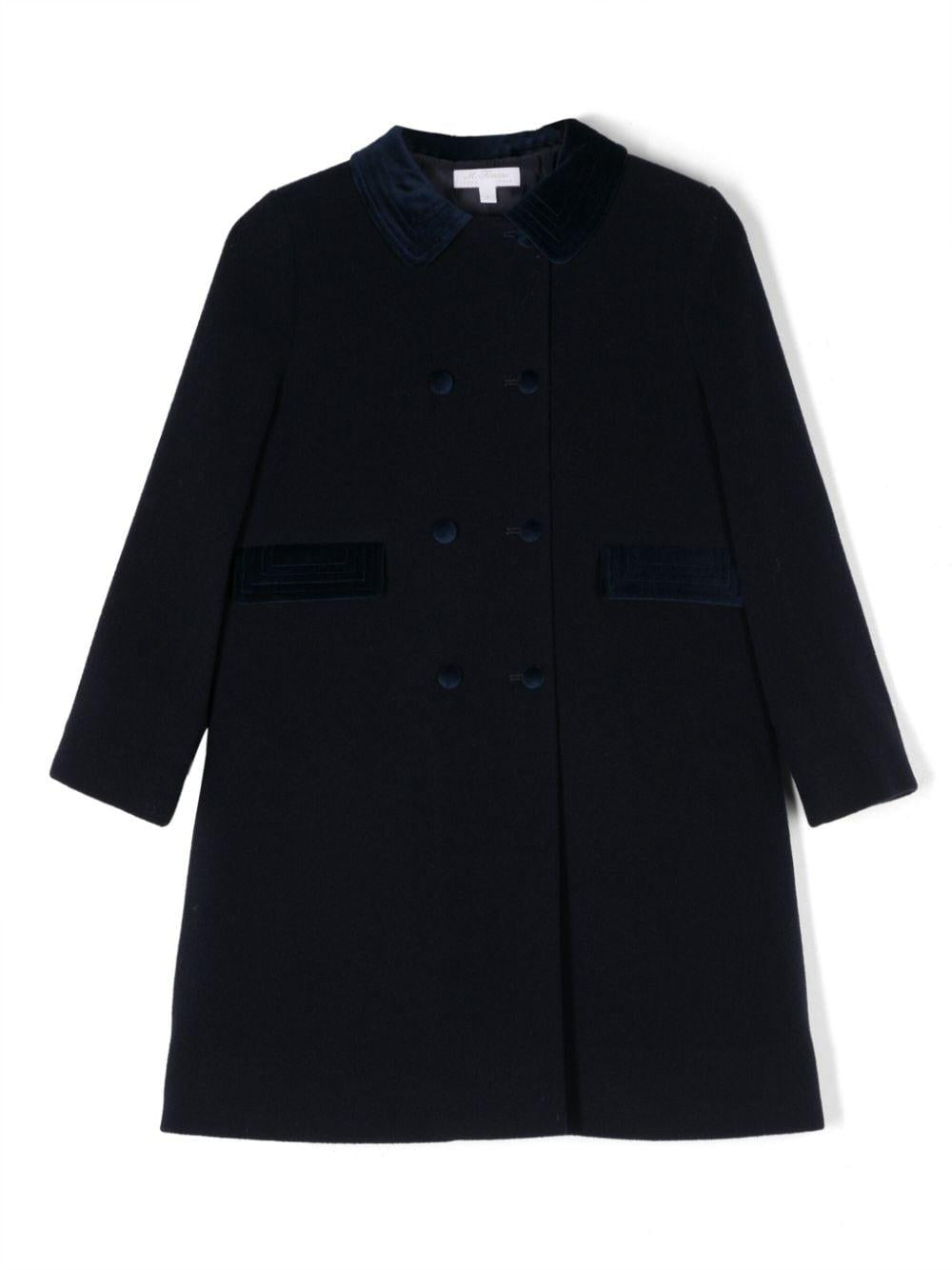 Cappotto blu bambina Mariella Ferrari. Doppiopetto con bordo a contrasto. lana 80%, poliammide 20%