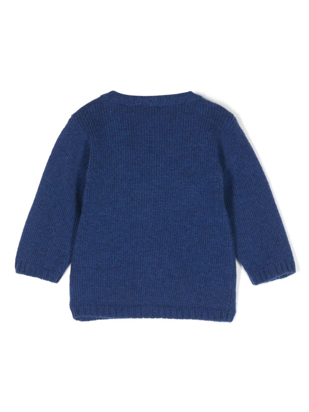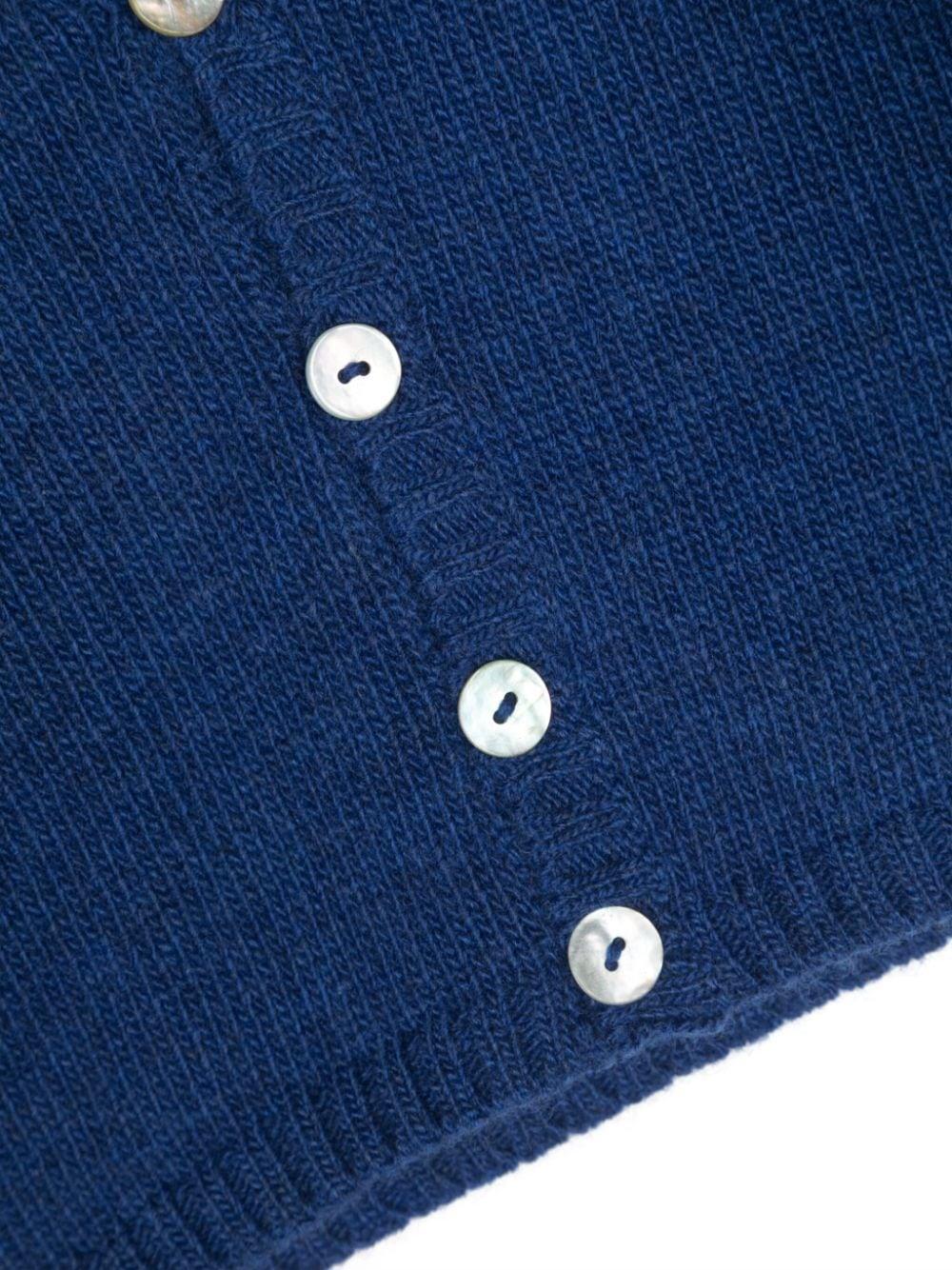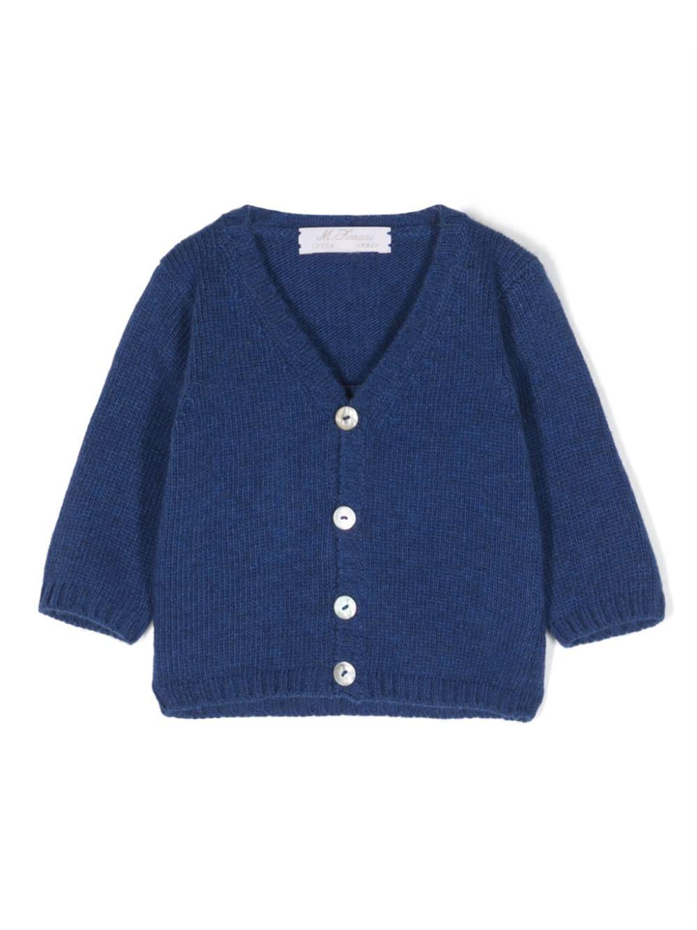 Cardigan blue navy neonata Ferrari Mariella. Design lavorato a maglia, scollo a V, chiusura frontale con bottoni e maniche lunghe. Lana Merino 70%, Cashmere 30%