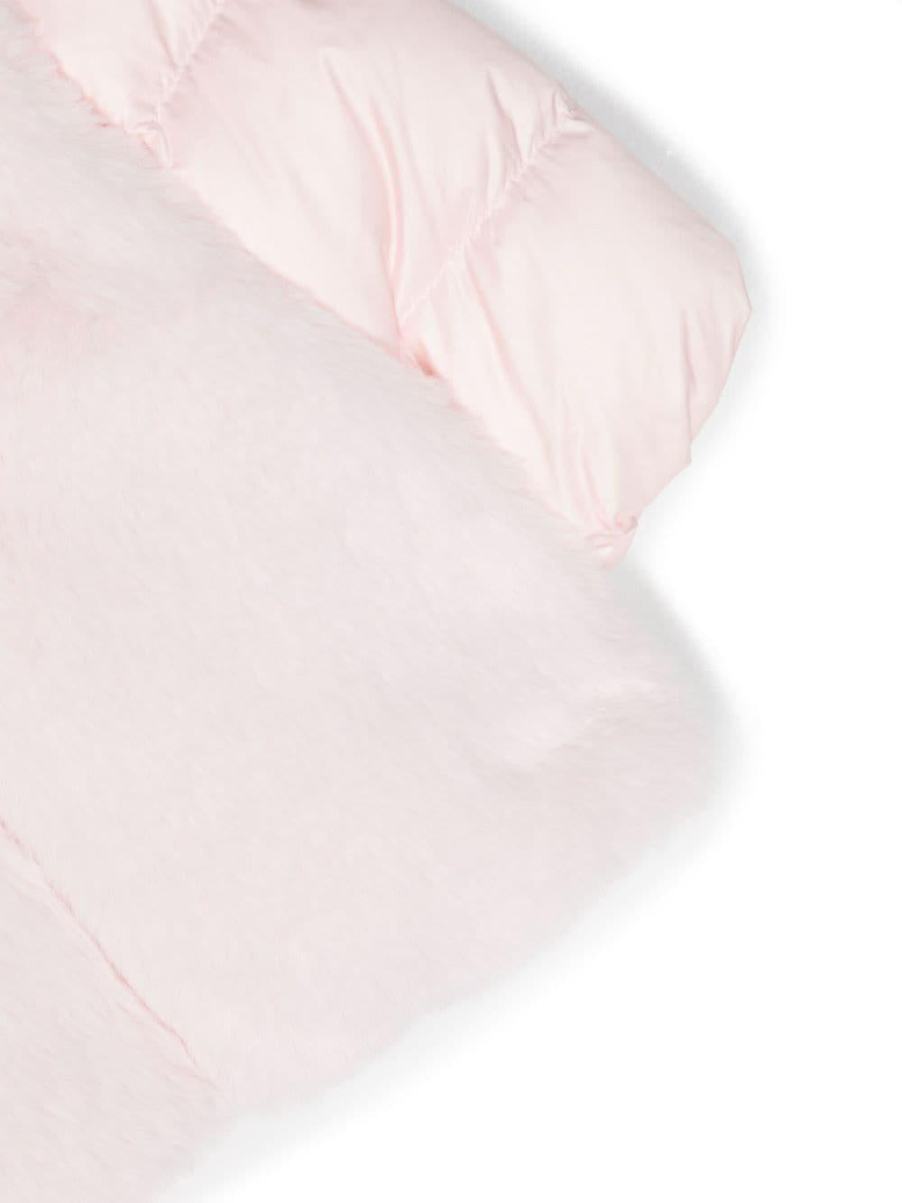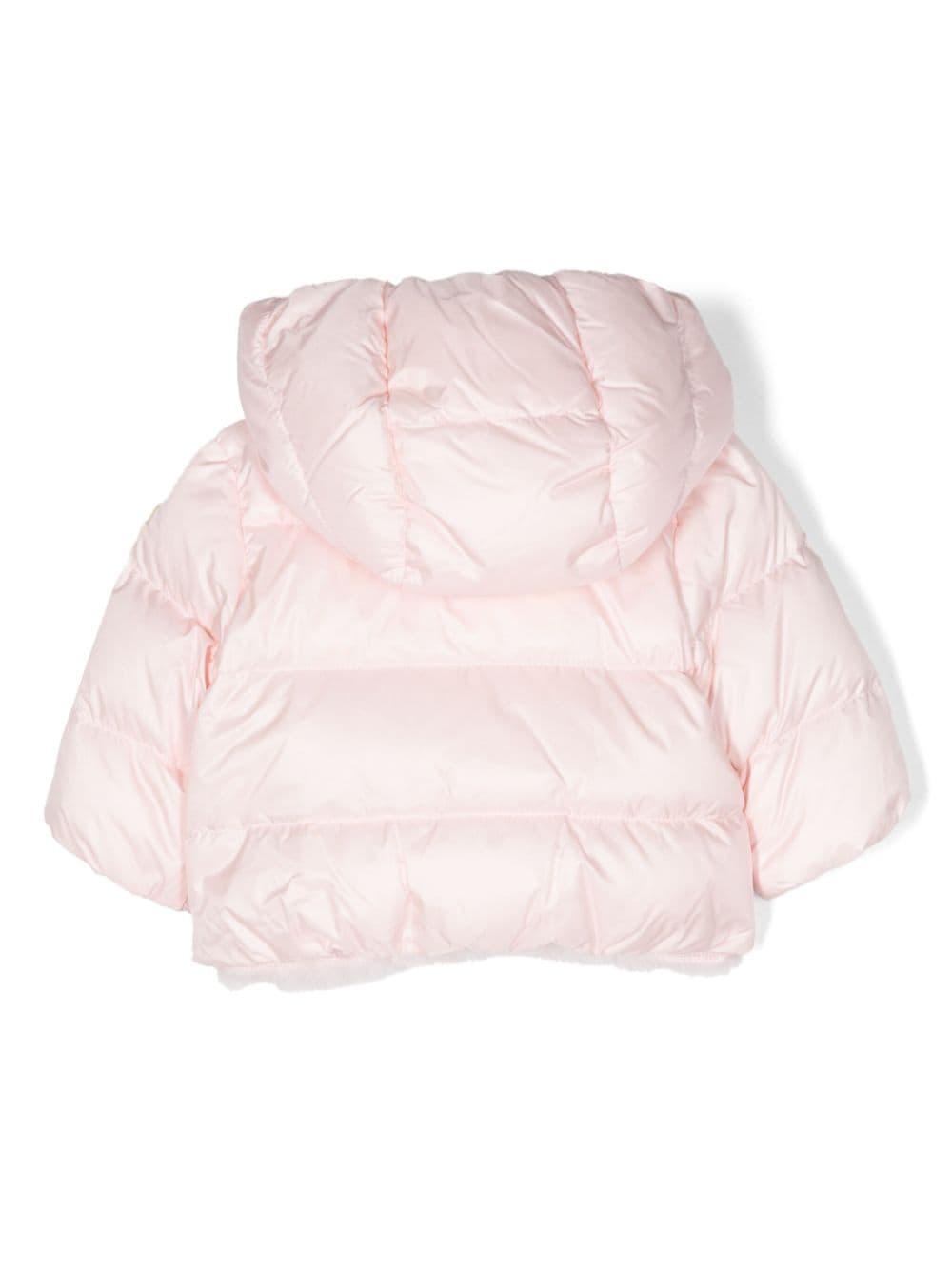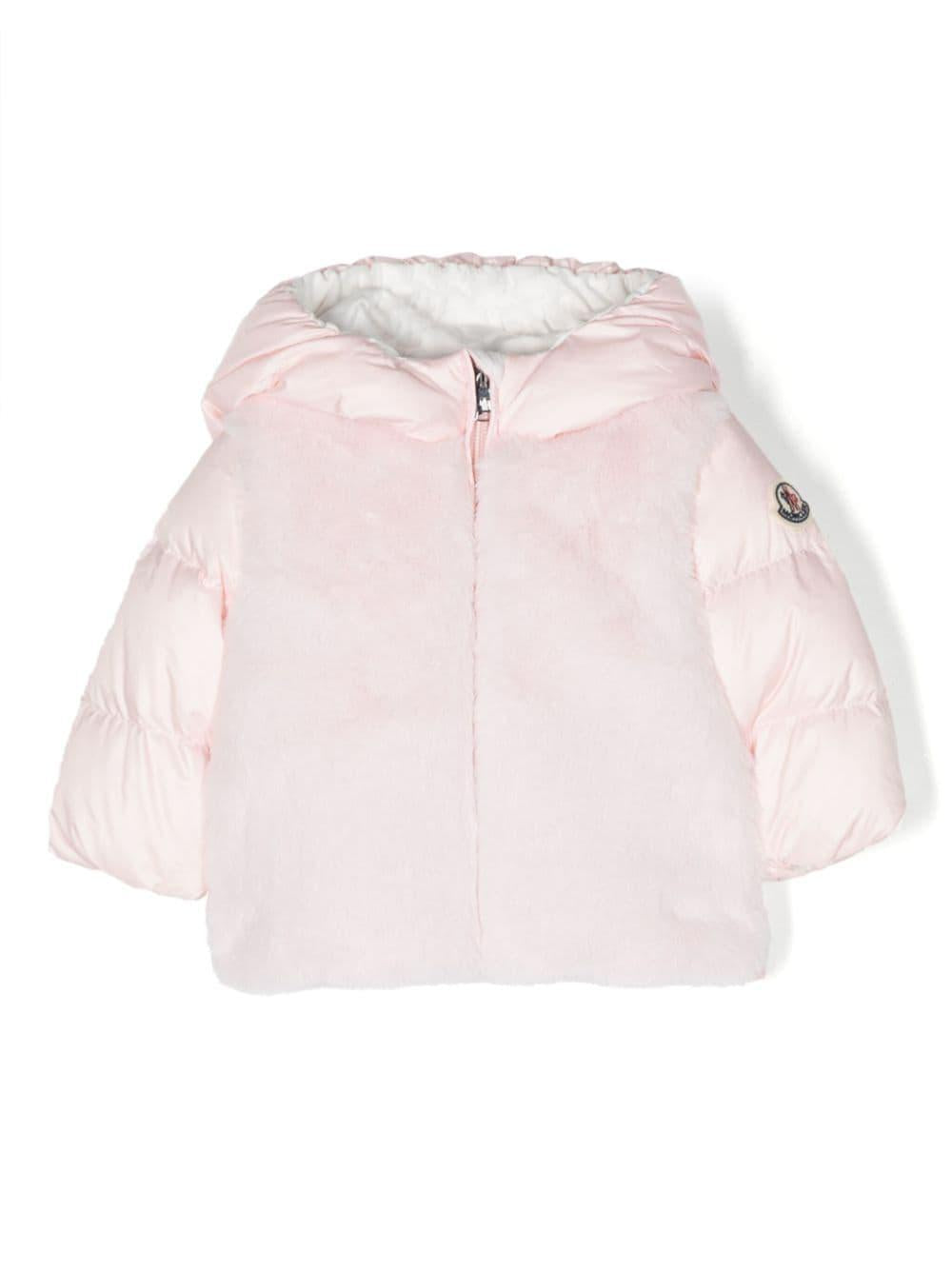 Giubbotto rosa neonata con logo Moncler kids, design imbottito, design a inserti, effetto pettinato, applicazione sulla manica con logo, cappuccio, chiusura frontale con zip, maniche lunghe e orlo dritto.ComposizioneEsterno: Poliestere 100%, Poliammide 100%Fodera: Cotone 100%, Piuma D'oca 100%