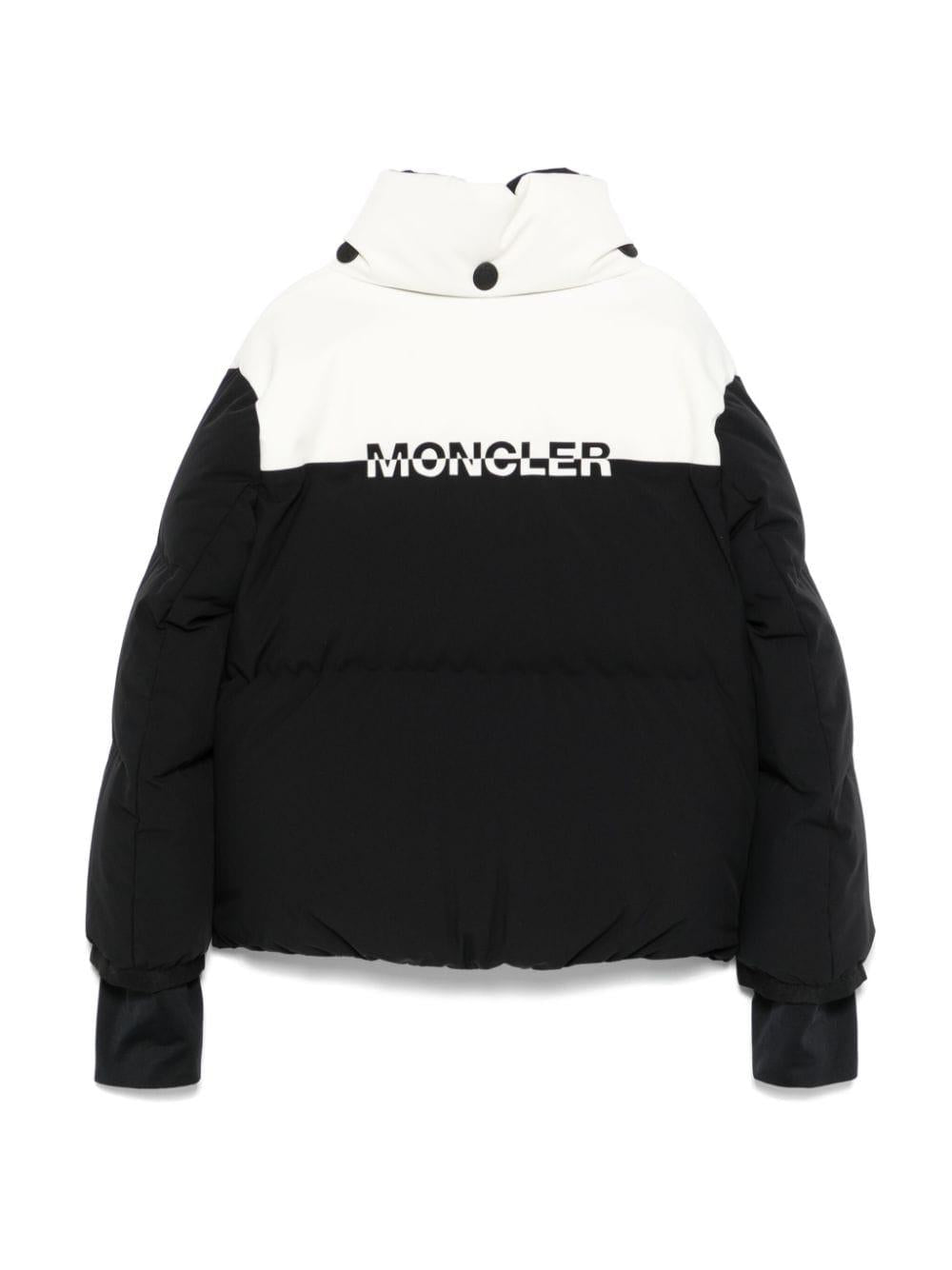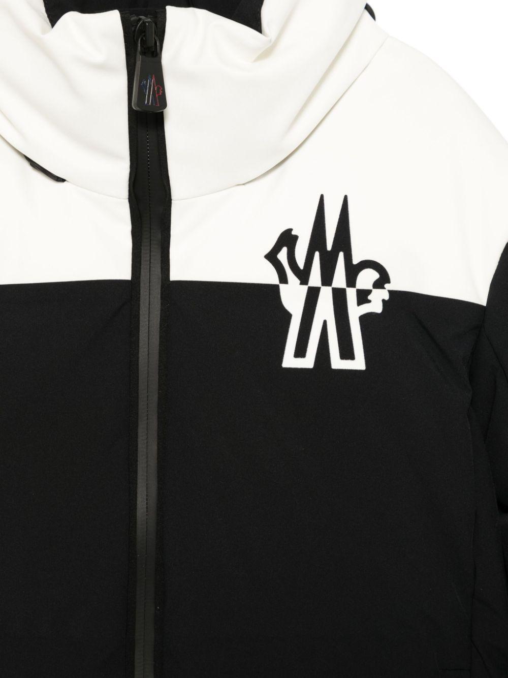Piumino nero/bianco unisex Moncler kids. Design imbottito, design bicolore, design trapuntato, chiusura frontale con zip, colletto rialzato, colletto rimovibile, maniche lunghe, tasca con zip sulla manica, fori per pollici, stampa con logo sul davanti, due tasche laterali con zip, stampa con logo sul retro, fodera integrale, tasca interna e orlo dritto. poliestere 100%, piuma d'oca 90%, piuma d'oca 10%
