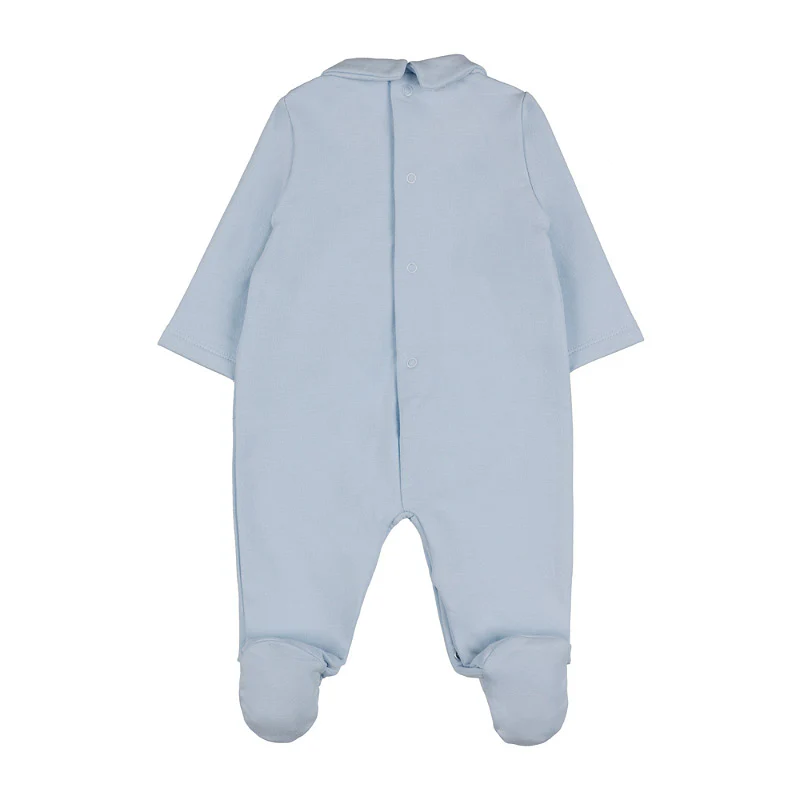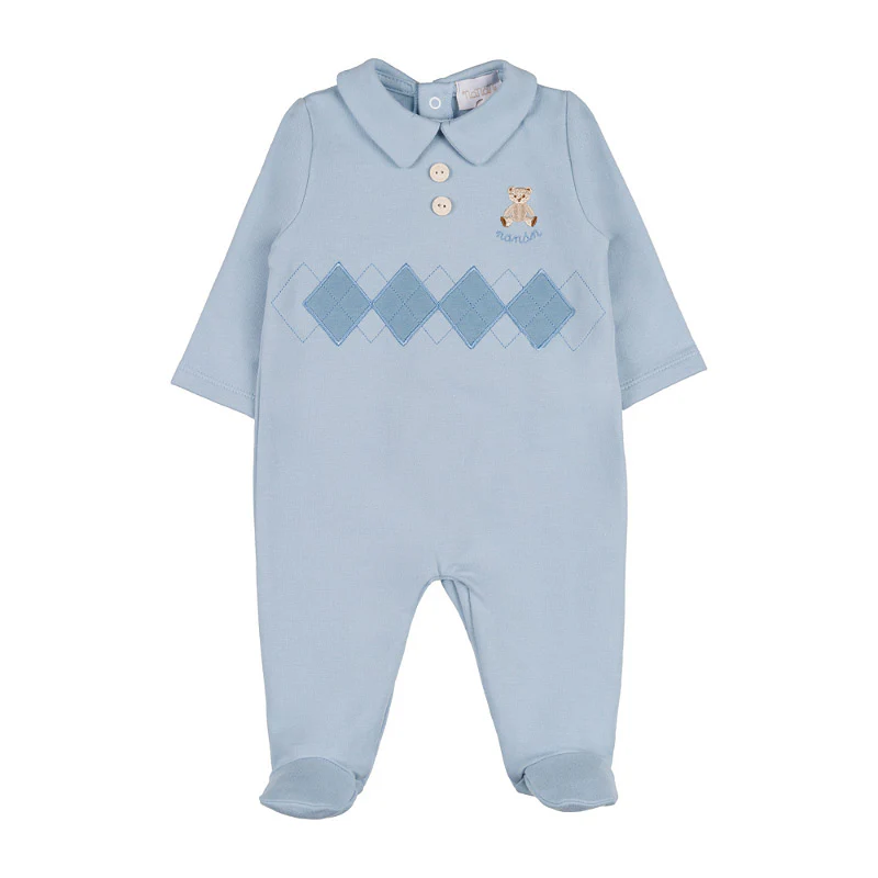 Tutina NANAN.Celeste,maniche lunghe,colletto a punta,bottoni applicati avanti,piedini,bottoni dietro e sotto le gambe,ricamo rombi e orsetto.95%cotone Organico - 5%elastan
