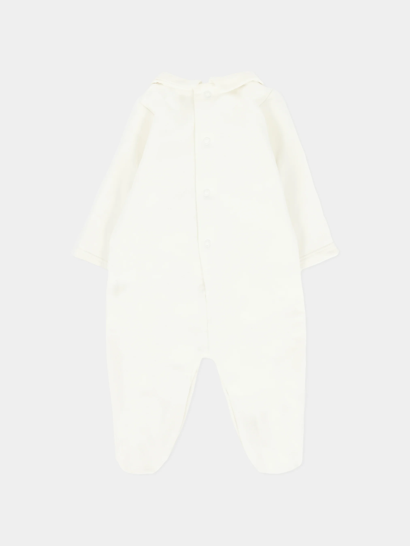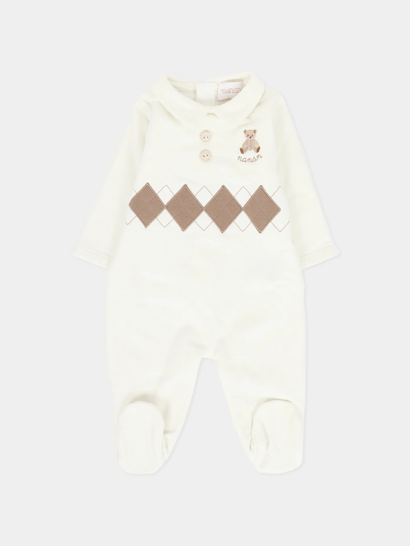 Tutina NANAN.Panna,maniche lunghe,colletto a punta,bottoni applicati avanti,piedini,bottoni dietro e sotto le gambe,ricamo rombi e orsetto.95%cotone Organico - 5%elastan
