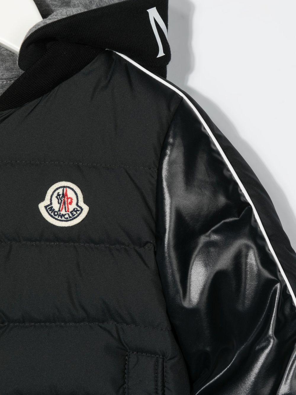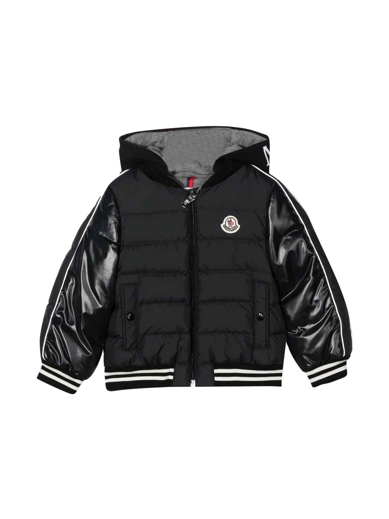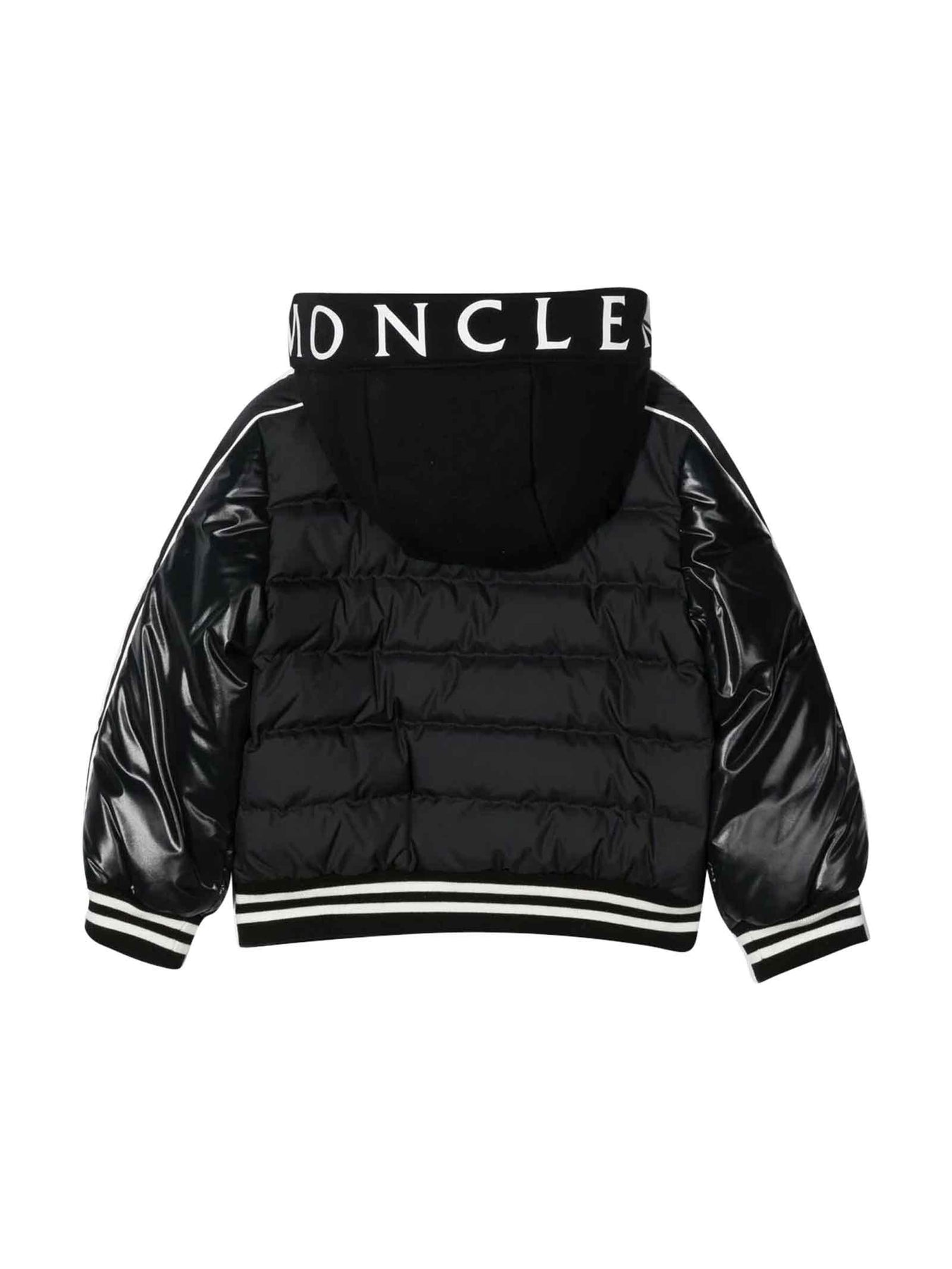 Giubbino nero neonato unisex Moncler kids con cappuccio. Design imbottito, design a inserti, stampa con logo sul cappuccio, applicazione con logo sul petto, chiusura frontale con zip, maniche lunghe, rifinitura a coste, bordo a righe e due tasche laterali con bottone. Piuma D'oca 100%, Cotone 100%