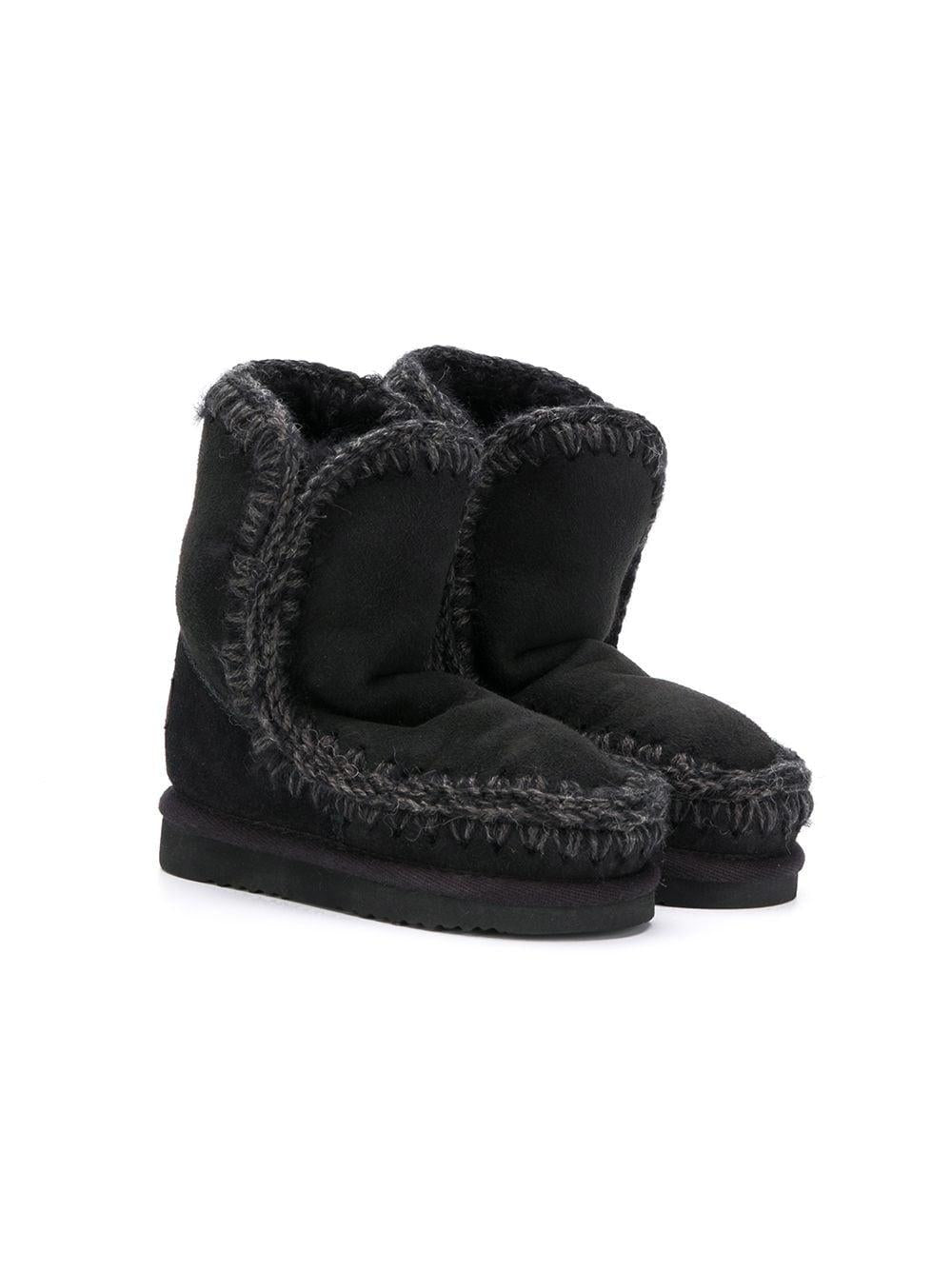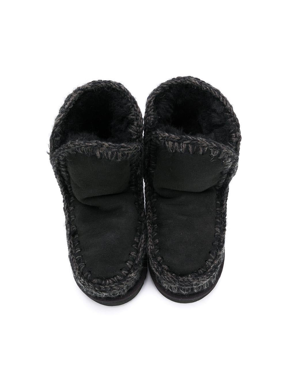 Stivali neri bambina Mou Kids. Design slip-on, orlo con punto festone, applicazione posteriore con logo, punta tonda, suola piatta in gomma, fodera in shearling e lunghezza alla caviglia. Suola in gomma 100%