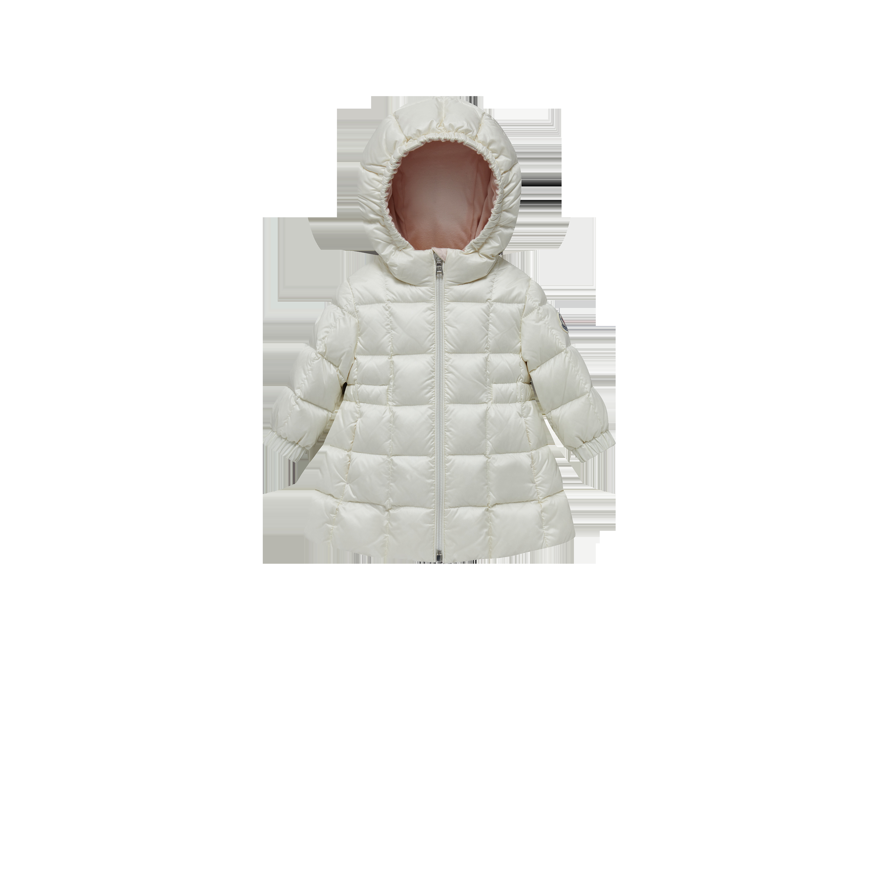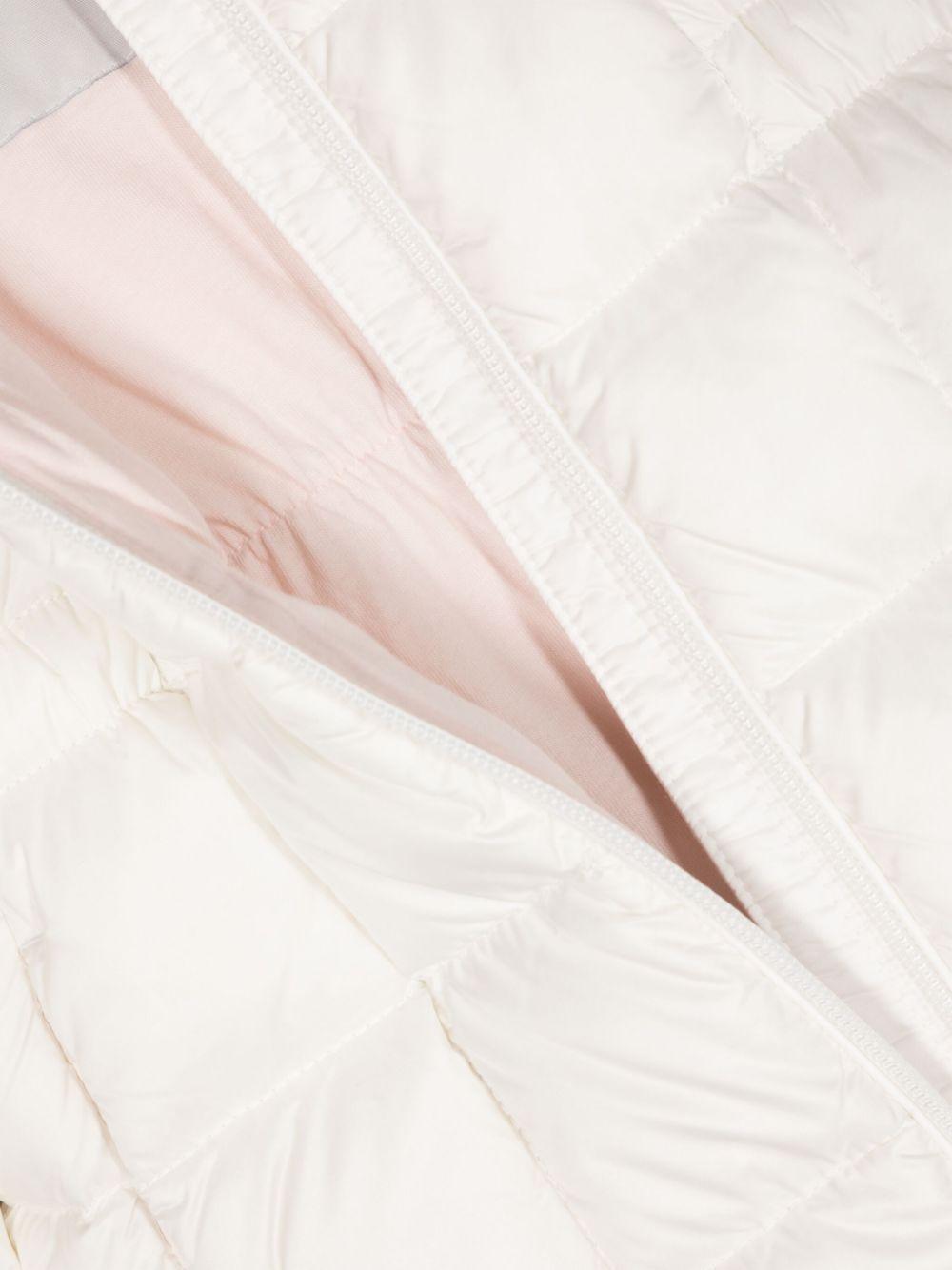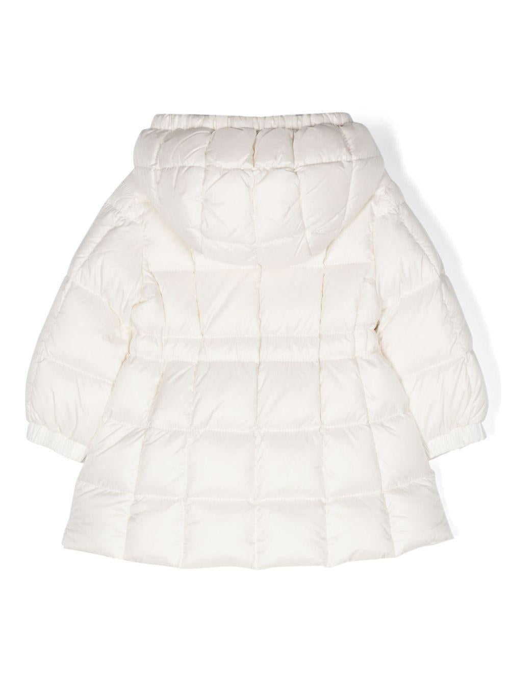 Piumino bianco neonata con applicazione Moncler kids, cotone, piumino d'oca, applicazione sulla manica con logo, design imbottito, cappuccio, chiusura frontale con zip, due tasche laterali a filetto, maniche lunghe, polsini elasticizzati e orlo dritto.ComposizioneEsterno: Nylon Riciclato 100%Fodera: Cotone 100%, Piuma D'oca 90%, Piuma D'oca 10%