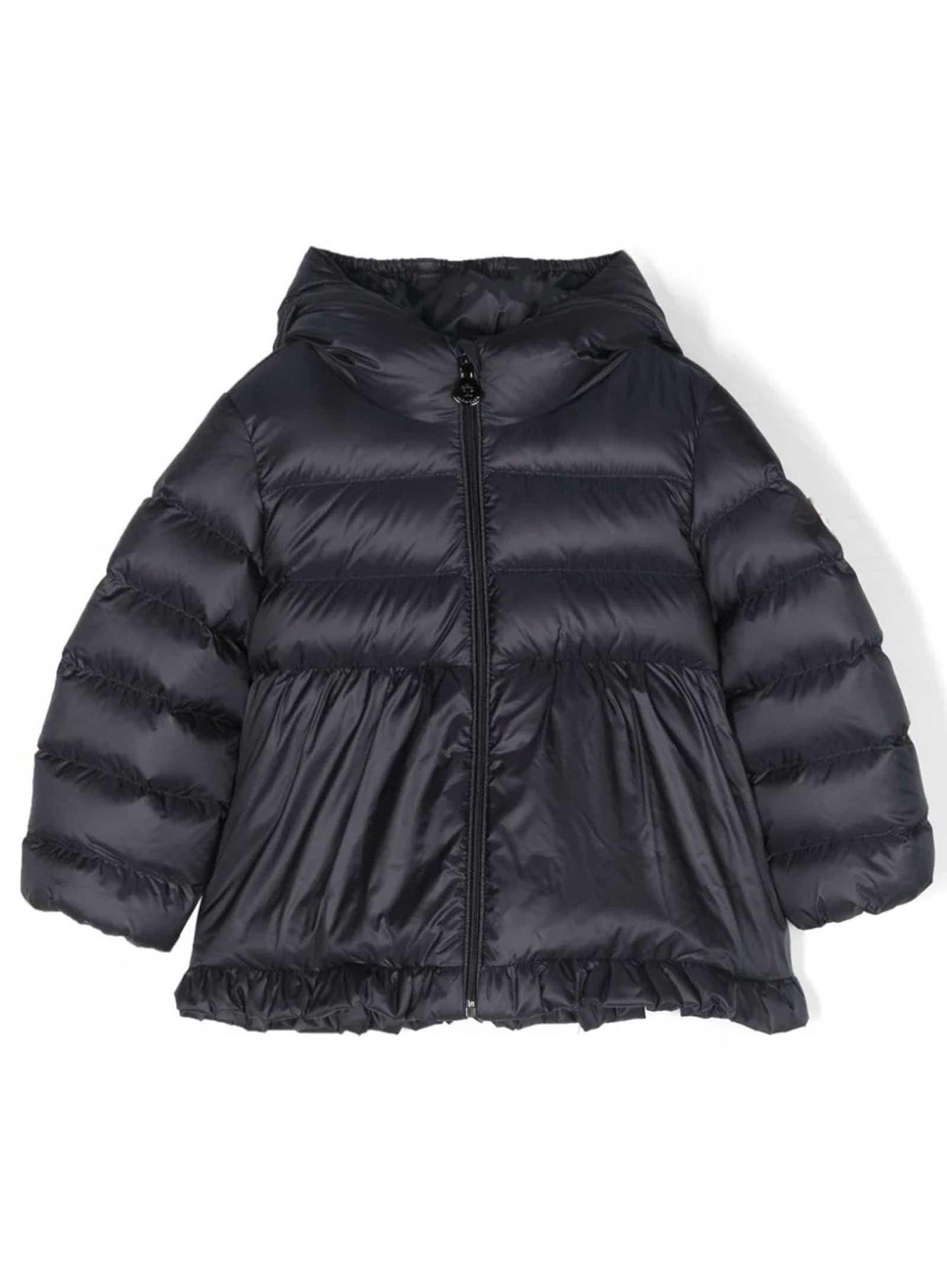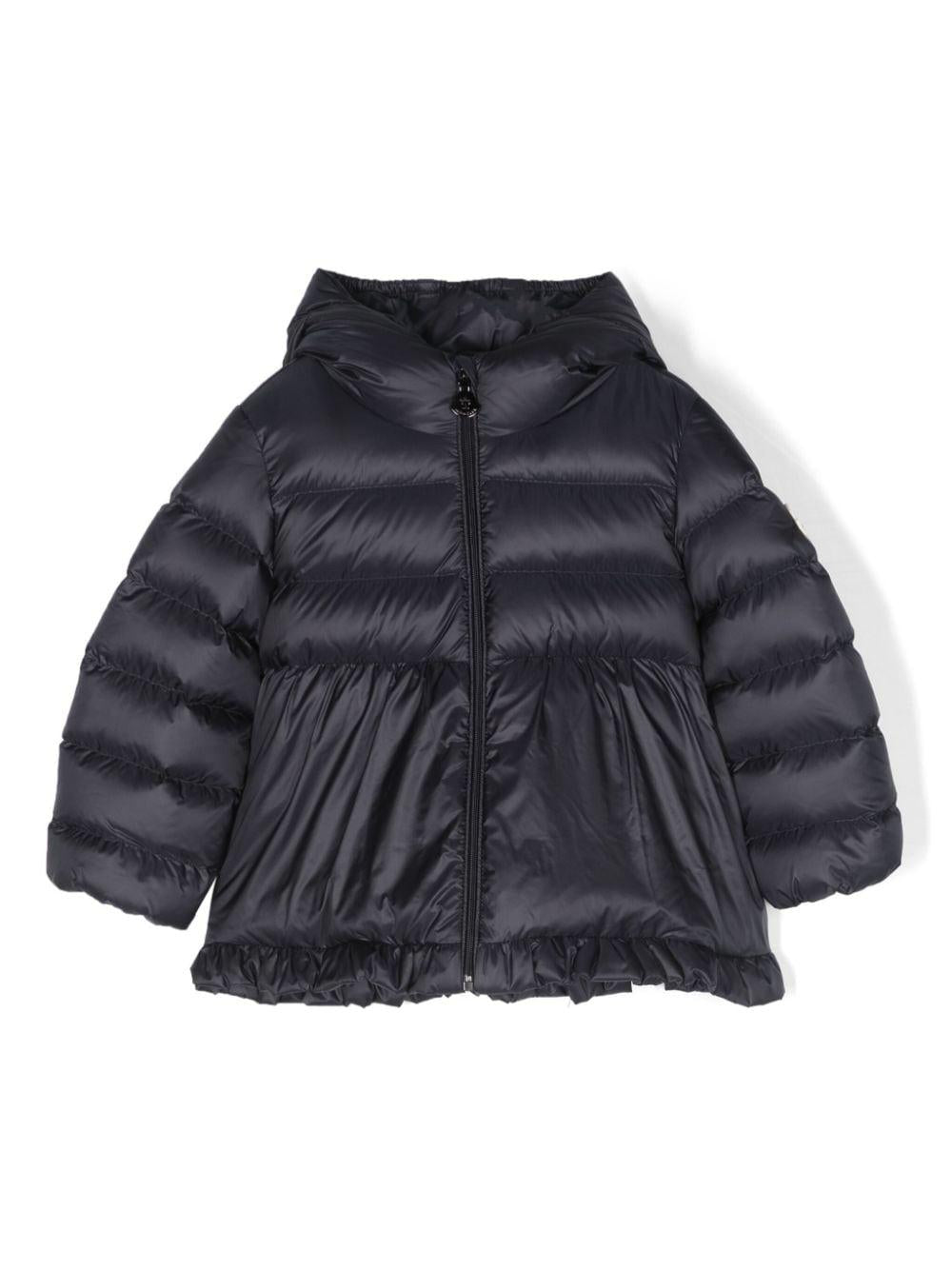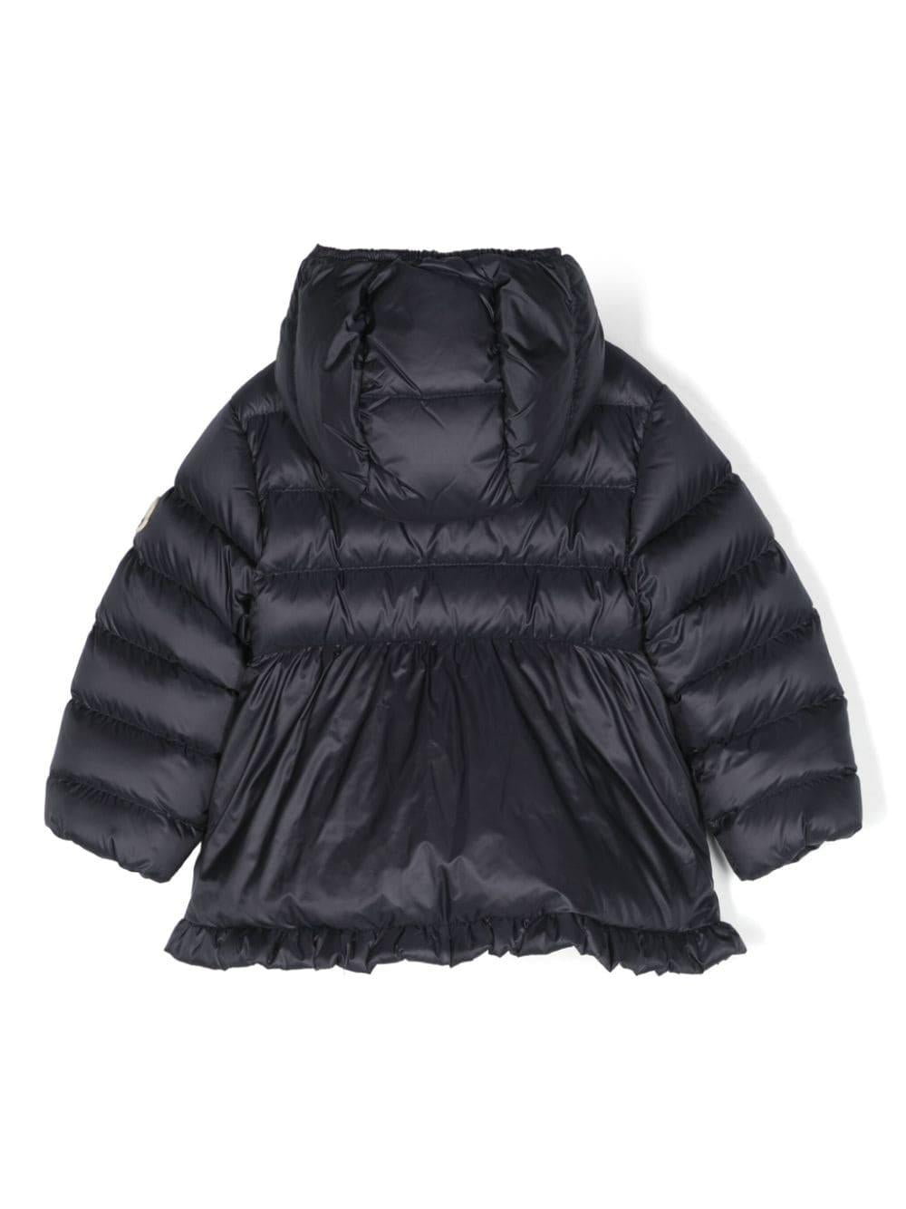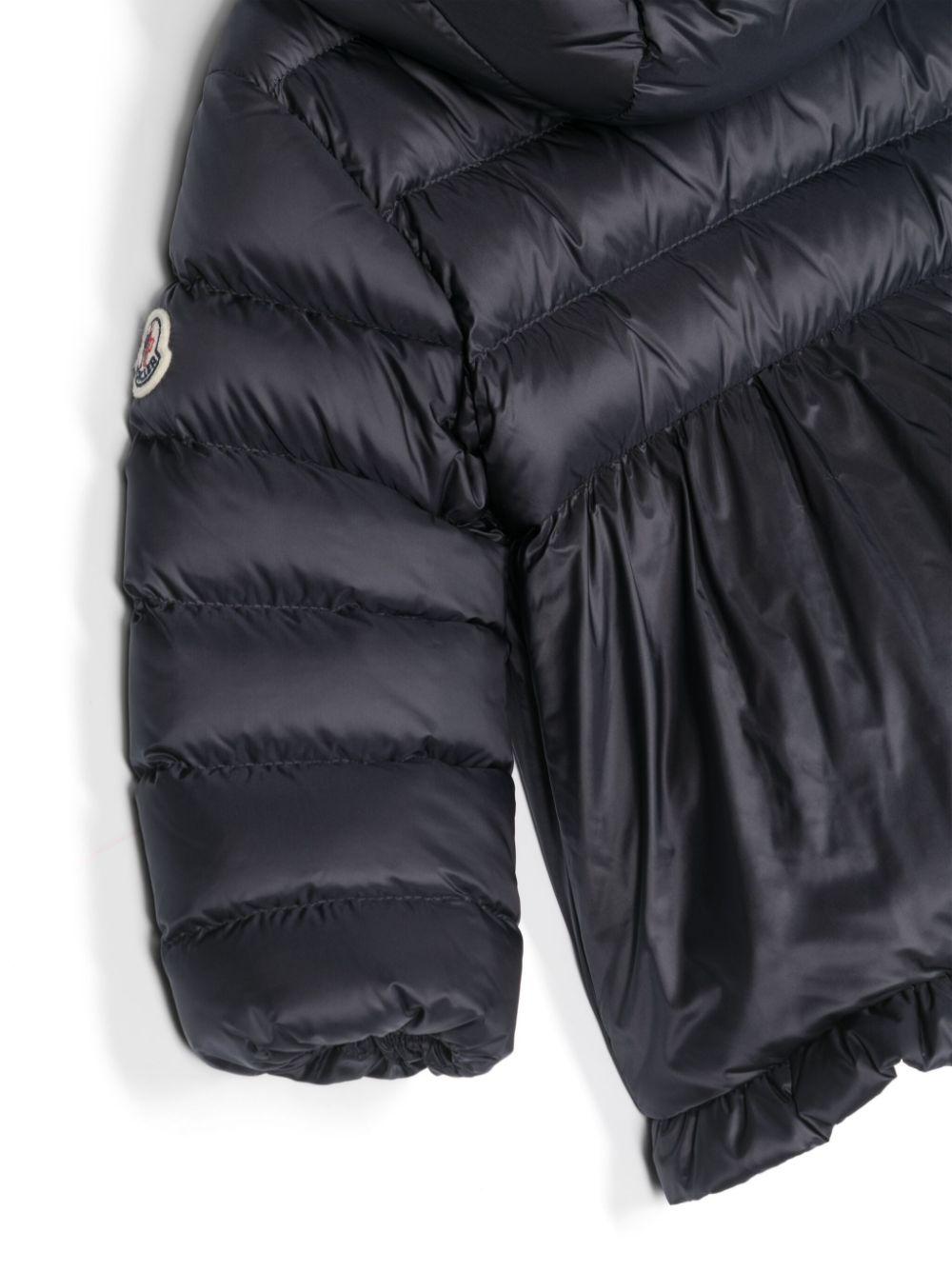 Piumino blu neonata con applicazione Moncler kids, piumino, design imbottito, cappuccio nascosto, applicazione sulla manica con logo, maniche lunghe, chiusura frontale con zip e polsini elasticizzati.ComposizioneFodera: Poliammide 100%, Piuma D'oca 100%Esterno: Poliammide 100%
