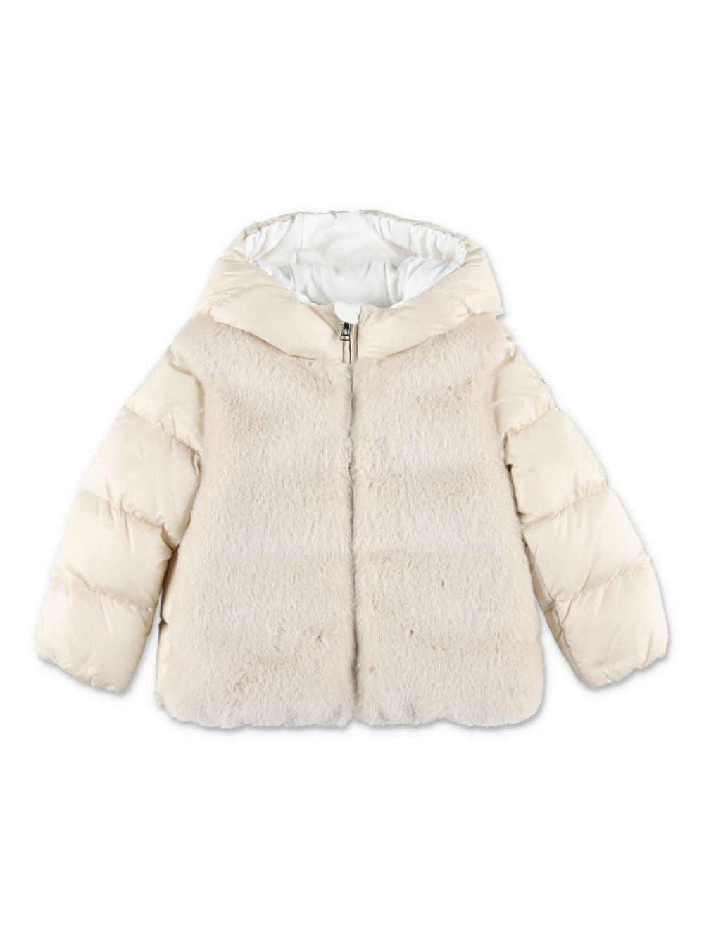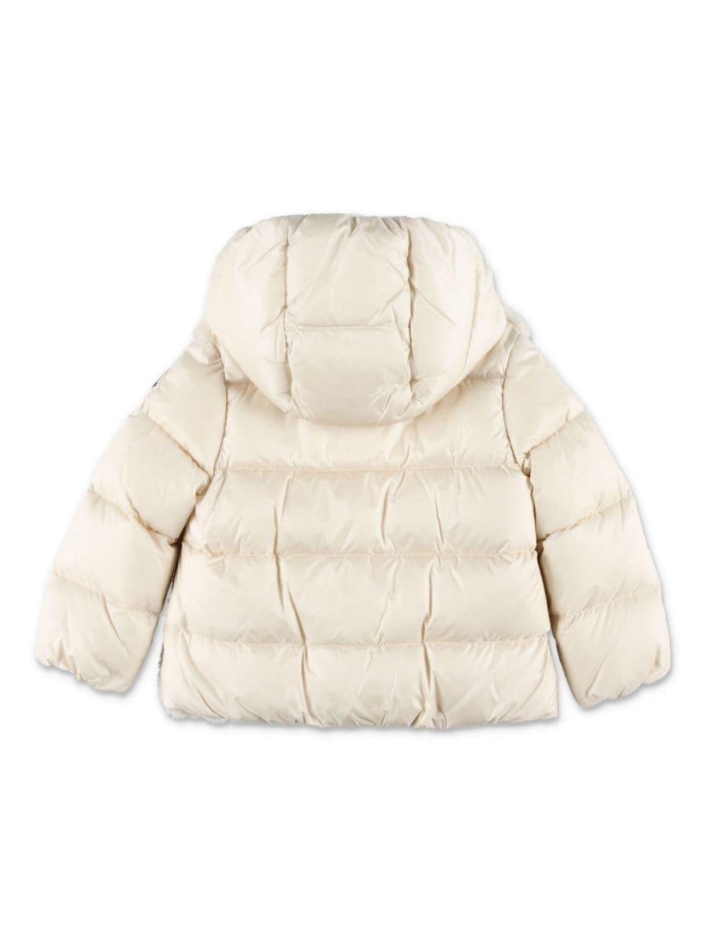Piumino panna neonata Moncler kids. Design in pelliccia cruelty-free, design imbottito, applicazione sulla manica con logo, cappuccio, maniche lunghe e orlo dritto. poliammide 100%