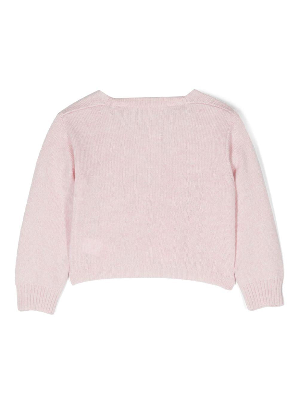 Cardigan rosa neonata Mariella Ferrari. Maglia fine, chiusura frontale con bottoni, scollo a V, maniche lunghe e orlo a coste. Lana Merino 70%, Cashmere 30%