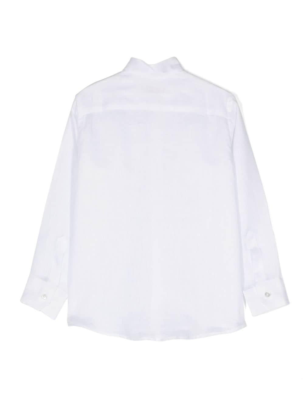 Camicia bianca bambino Ferrari Mariella. Tessuto mosso, design semi trasparente, colletto alla coreana, maniche lunghe con polsini elasticizzati, orlo curvo, chiusura frontale con bottoni. lino 100%
