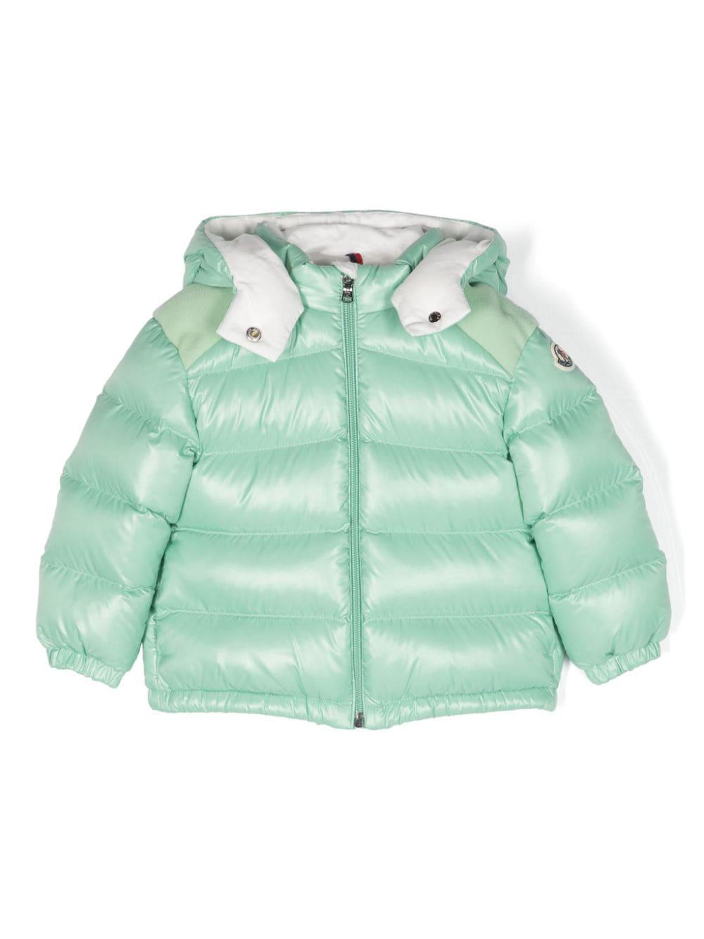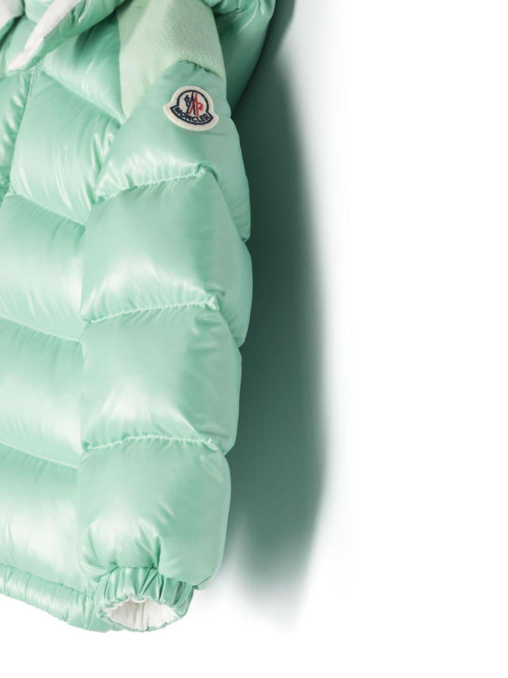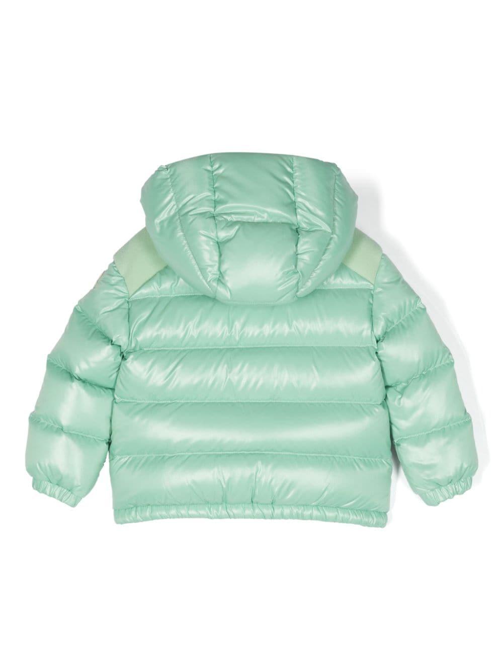 Giubbotto verde neonato con logo Moncler kids, piumino d'oca, design imbottito, applicazione sulla manica con logo, cappuccio nascosto, chiusura frontale con zip, maniche lunghe, polsini elasticizzati e orlo elasticizzato.ComposizioneEsterno: Poliammide 100%Fodera: Cotone 100%, Piuma D'oca 100%, Poliestere 93%, Elastam 7%