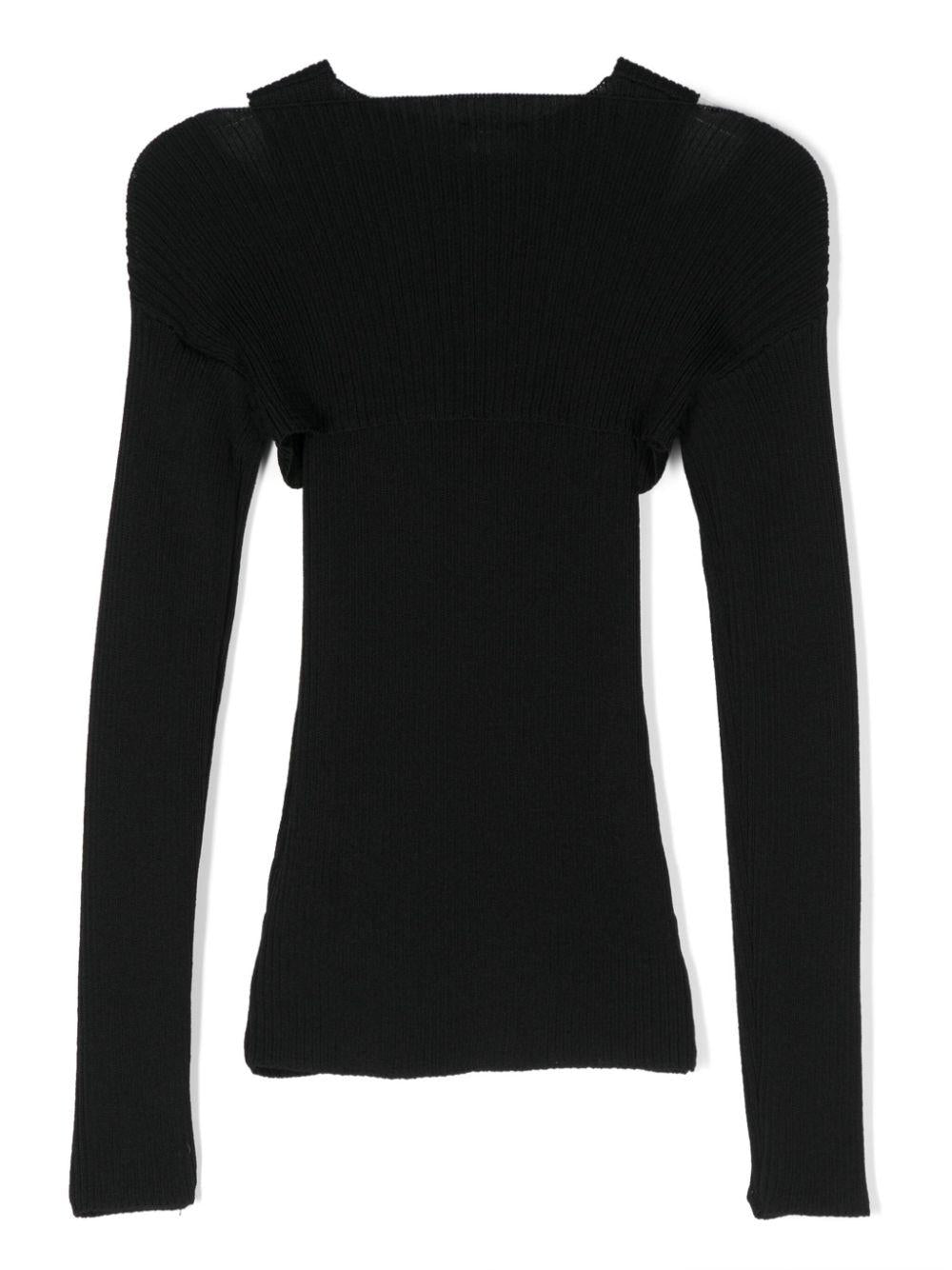 Maglione nero bambina Monnalisa kids. Lavorazione a coste, dettagli con design a più strati, placca con logo color argento, scollo rotondo, design con spalle scoperte, maniche lunghe e orlo dritto. viscosa 65%, poliammide 35%