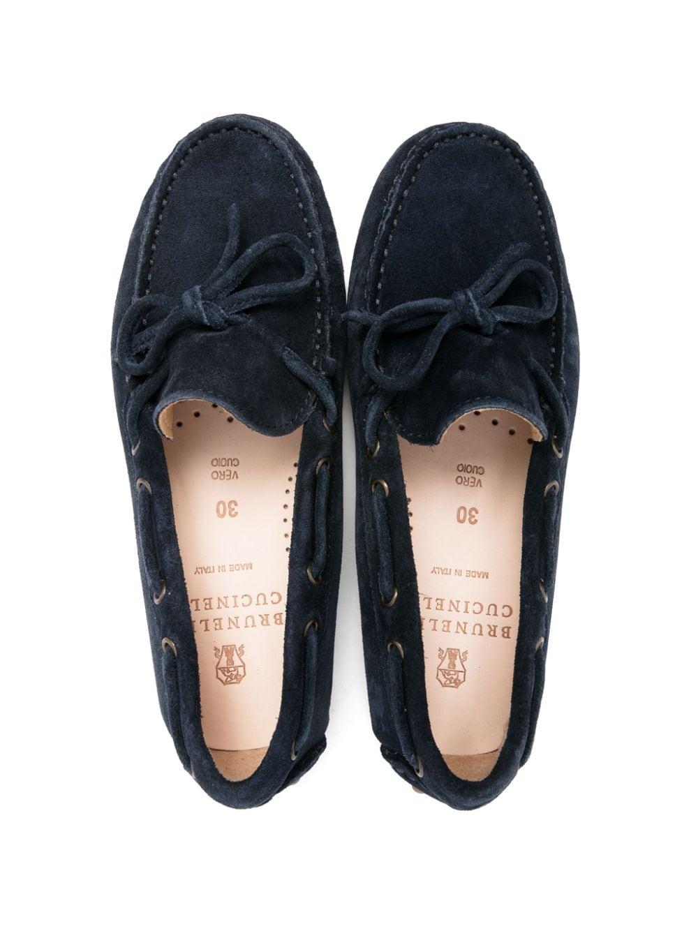 Mocassini bambino blu navy Brunello Cucinelli Kids.Pelle scamosciata di vitello,orlo con punto festone,punta smussata,design con lacci decorativi,soletta con logo,fodera in pelle,suola a carrarmato in gomma,design slip-on.Composizione: Fodera: pelle di vitello 100% Esterno: pelle scamosciata di vitello 100% Suola: gomma 100%