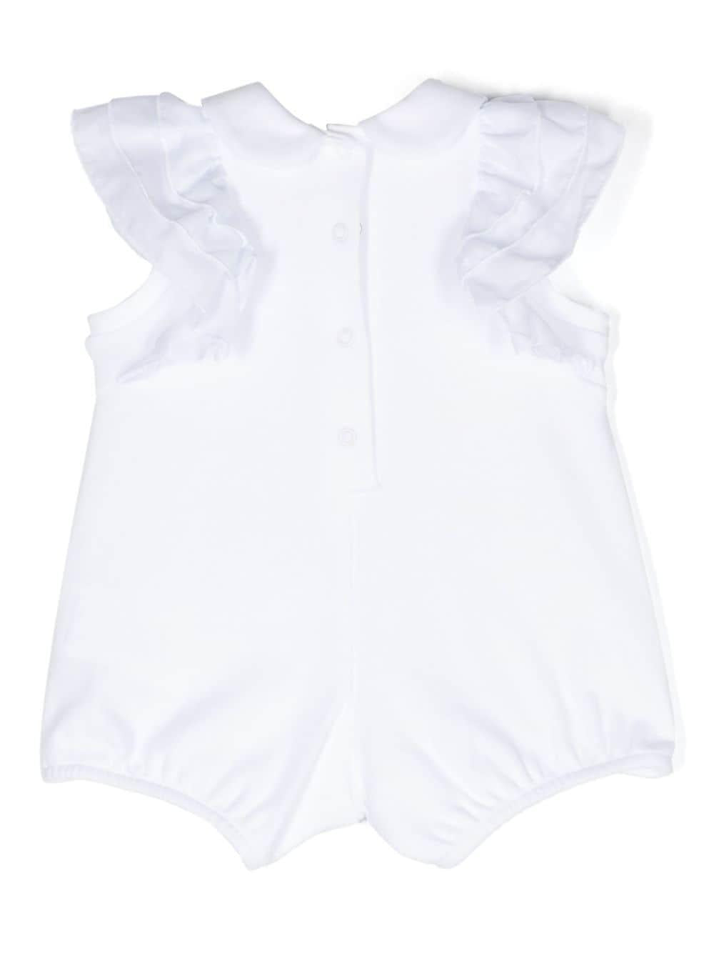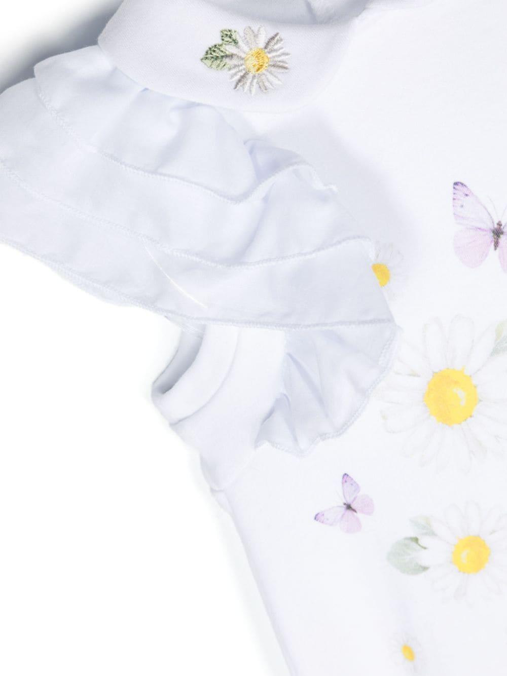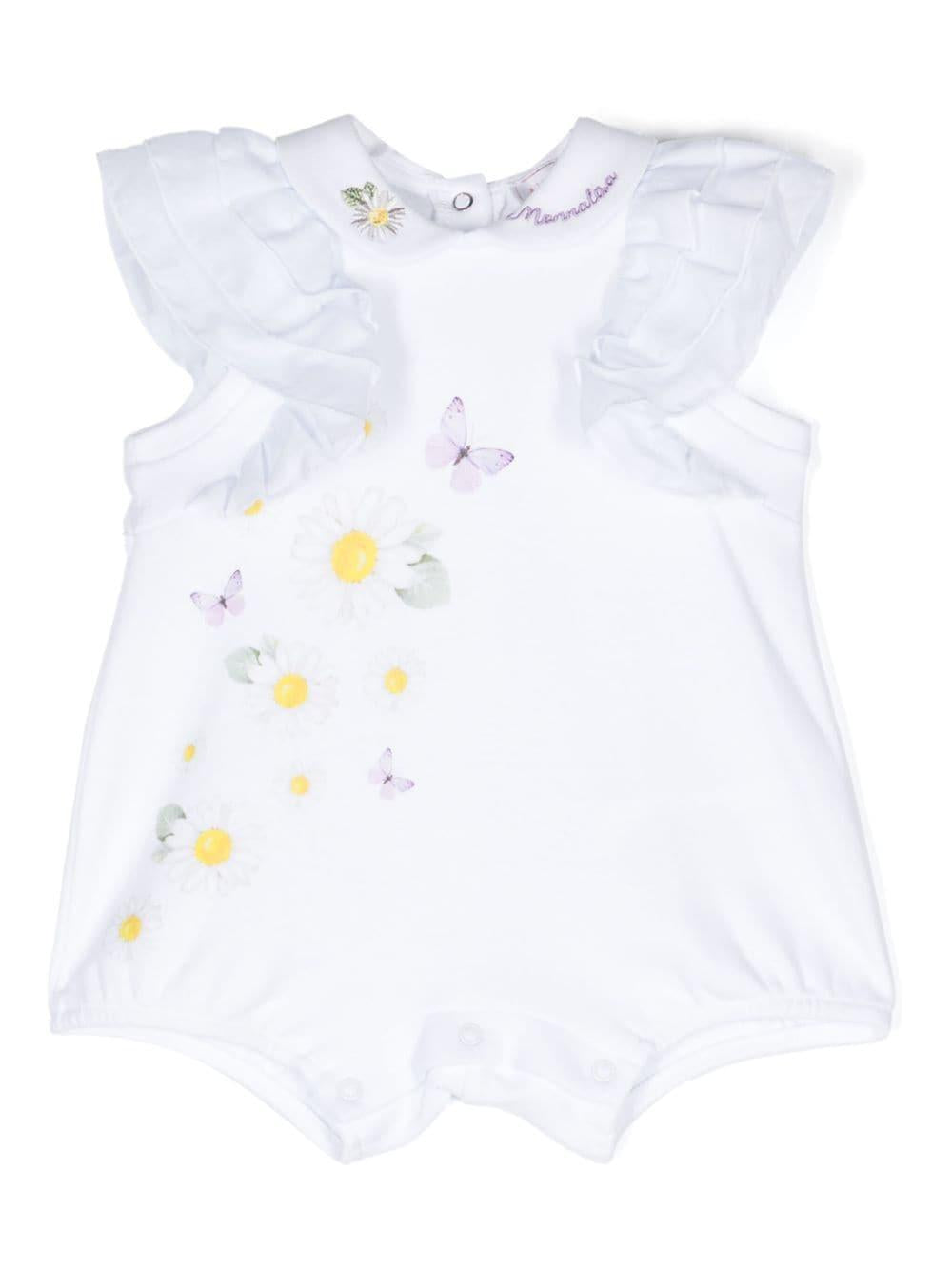 Body a fiori bambina bianco Monnalisa Kids.Bianco,cotone,logo ricamato,stampa a fiori,dettagli con ruches,colletto Peter Pan,chiusura con bottoni a pressione,senza maniche,design a pezzo unico.Composizione: cotone 100%