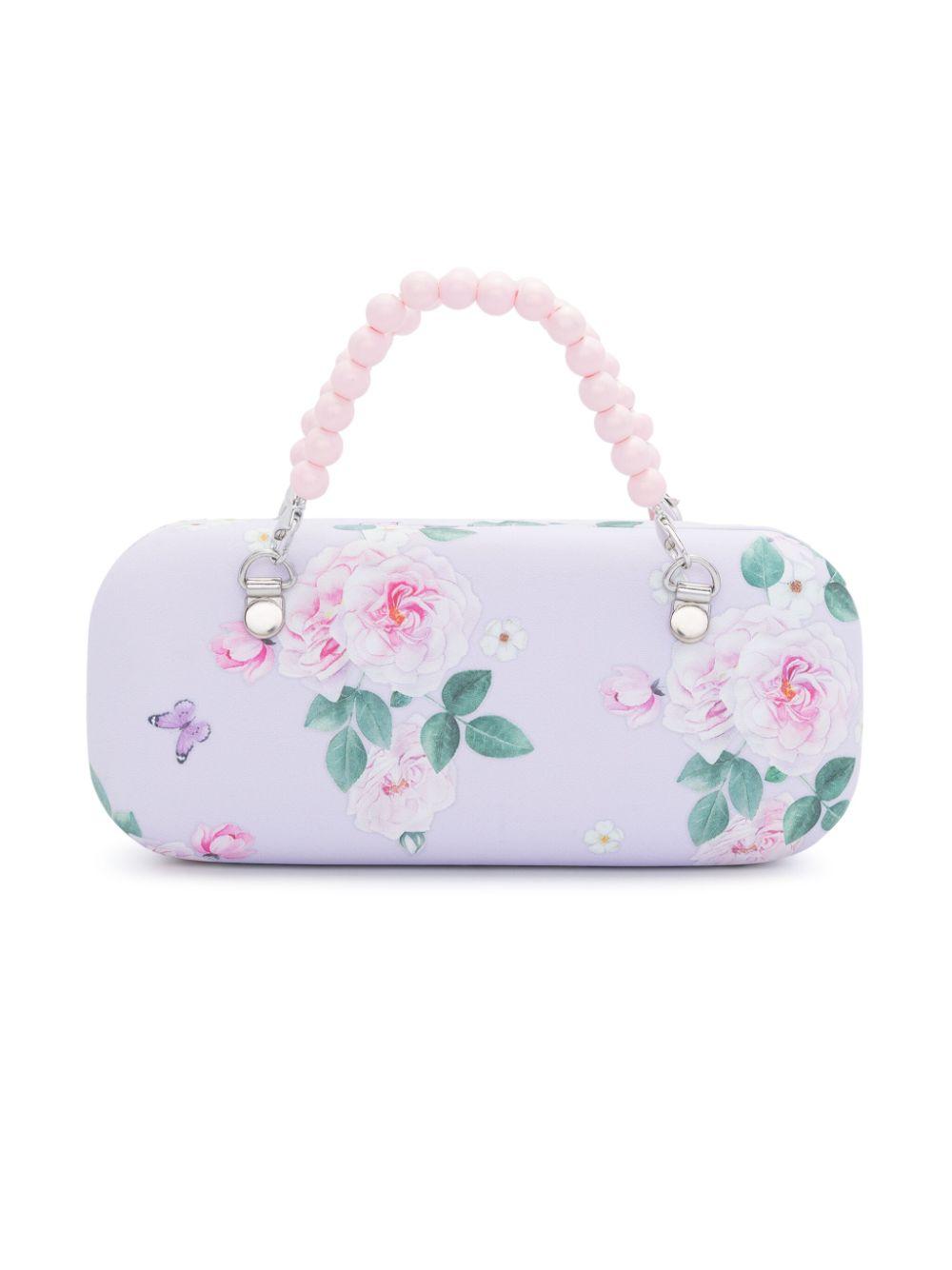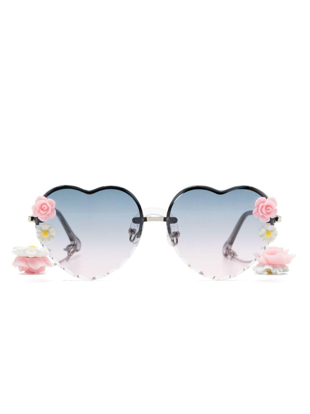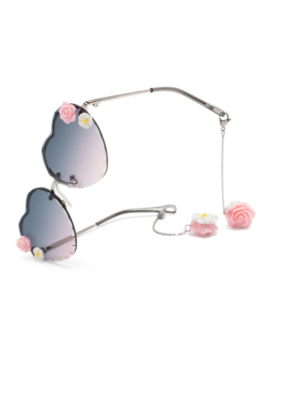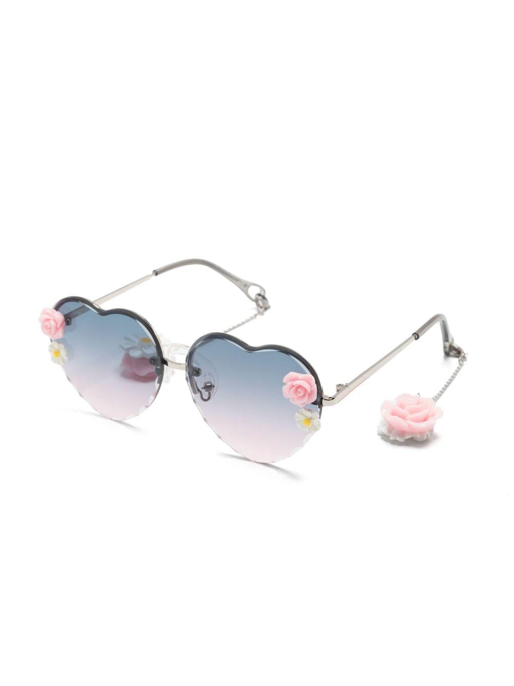 Occhiali da sole glicine bambina Monnalisa kids. Finitura metallizzata, applicazione a fiori, dettaglio a catena rimovibile in vita, montatura a forma di cuore, lenti sfumate, lenti con protezione UV, naselli, aste dritte e aste con punta curva. policarbonato 100%