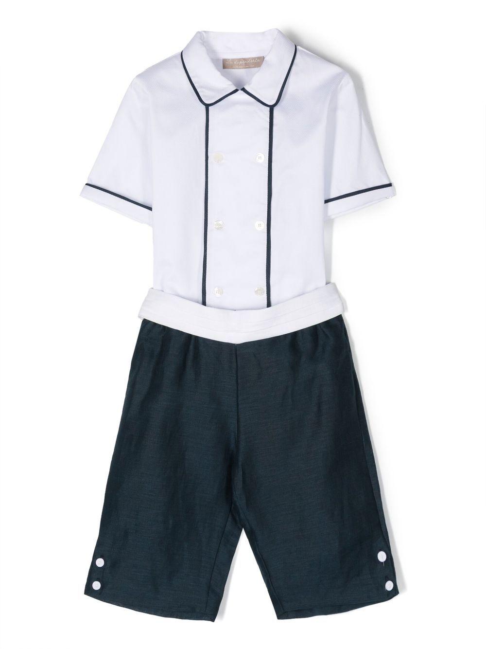 Completo bianco/blu bambino La Stupenderia. Dettagli con bordino, colletto Peter Pan, chiusura con bottoni a doppio petto, maniche corte, polsini con risvolto, chiusura con bottoni laterali e gamba dritta. Cotone 100%