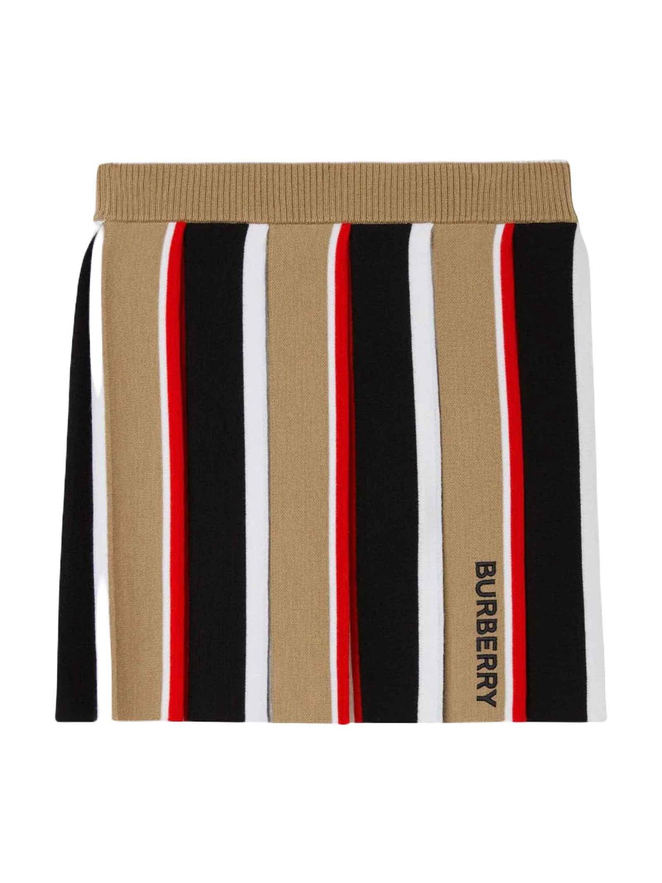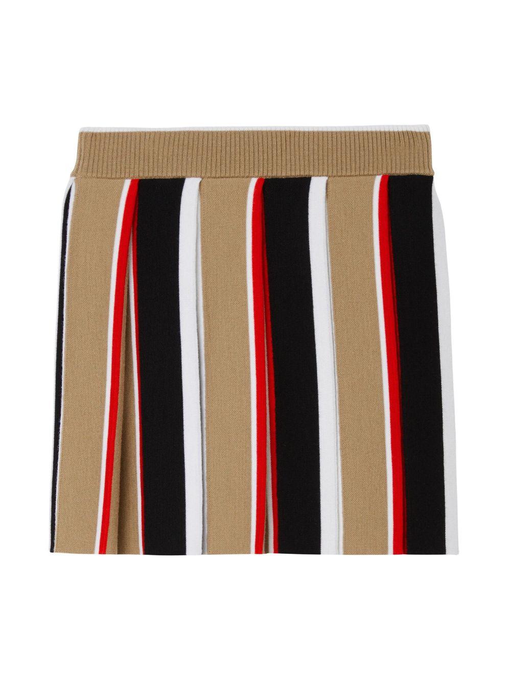 Gonna beige bambina Burberry kids. Motivo a strisce, elastico in vita, logo ricamato sul davanti e bordo a costine. Lana 98%, Poliammide 1%, Elastan 1%