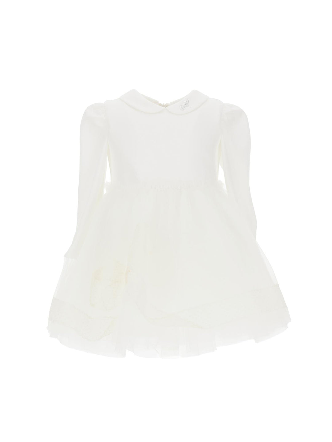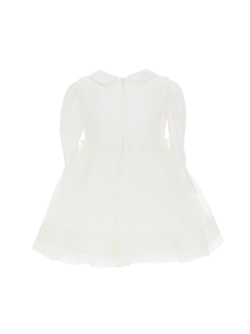 Abito bianco neonata,con fiocco frontale e laterale,dettaglio gonna rouches,chiusura posteriore con zip
