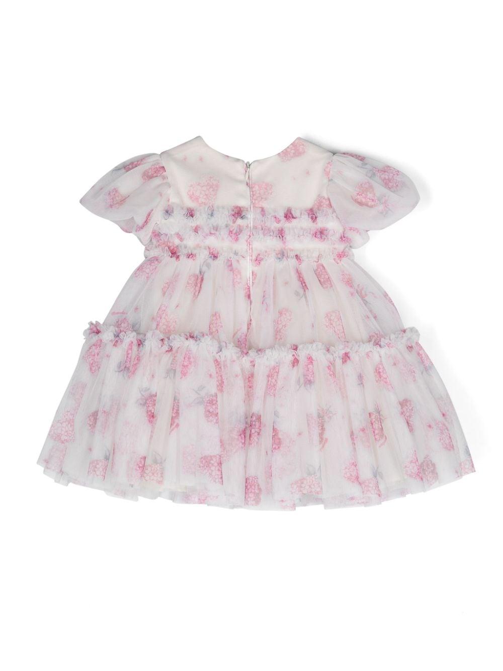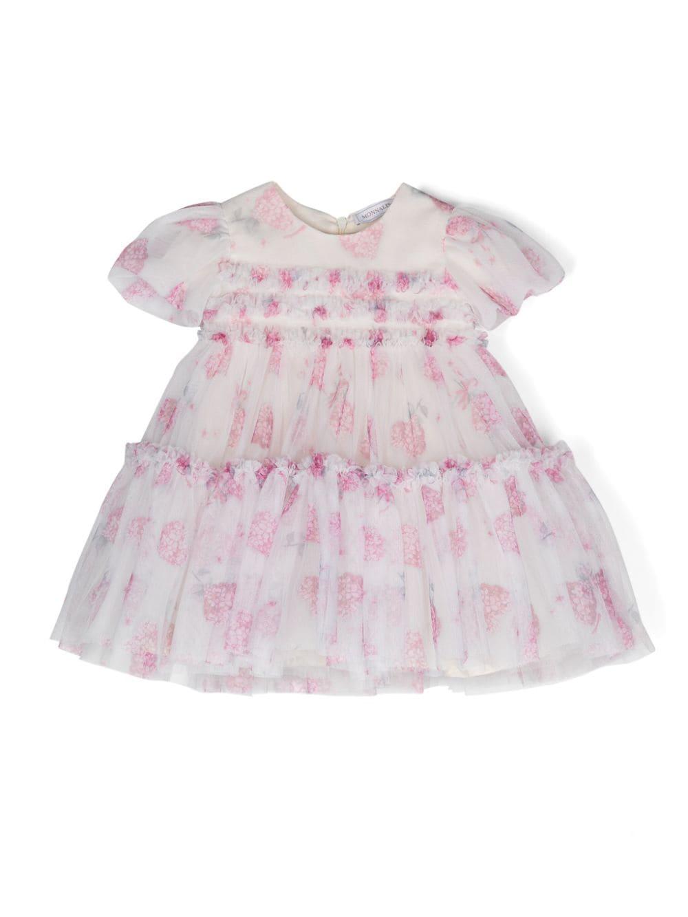 Abito a fiori MONNALISA.Bianco/rosa,strato superiore in tulle,stampa a fiori,design a più strati,corpetto con ruches,scollo rotondo,maniche corte a palloncino,orlo svasato,fodera in cotone,chiusura posteriore con zip nascosta.Esterno: poliestere 100%Fodera: cotone 100%