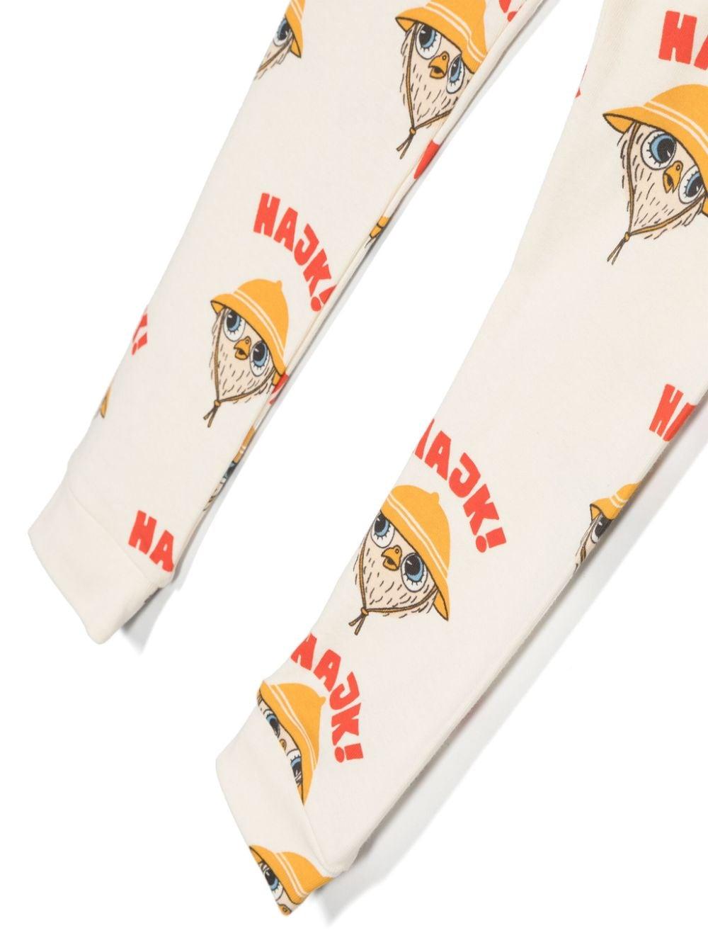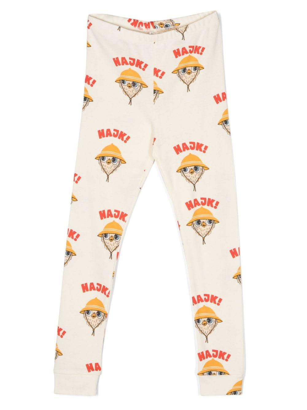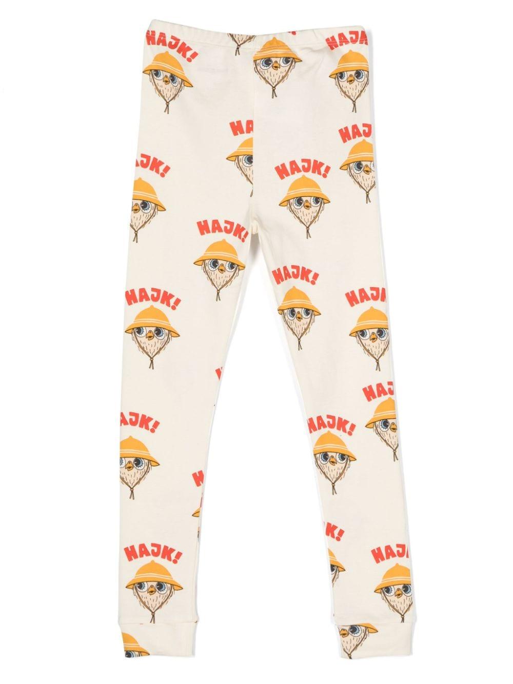 Leggins beige bambina Mini Rodini. Stampa Hajk! all-over, etichetta interna con logo, gamba affusolata, orli a coste e vita elasticizzata. cotone biologico 100%