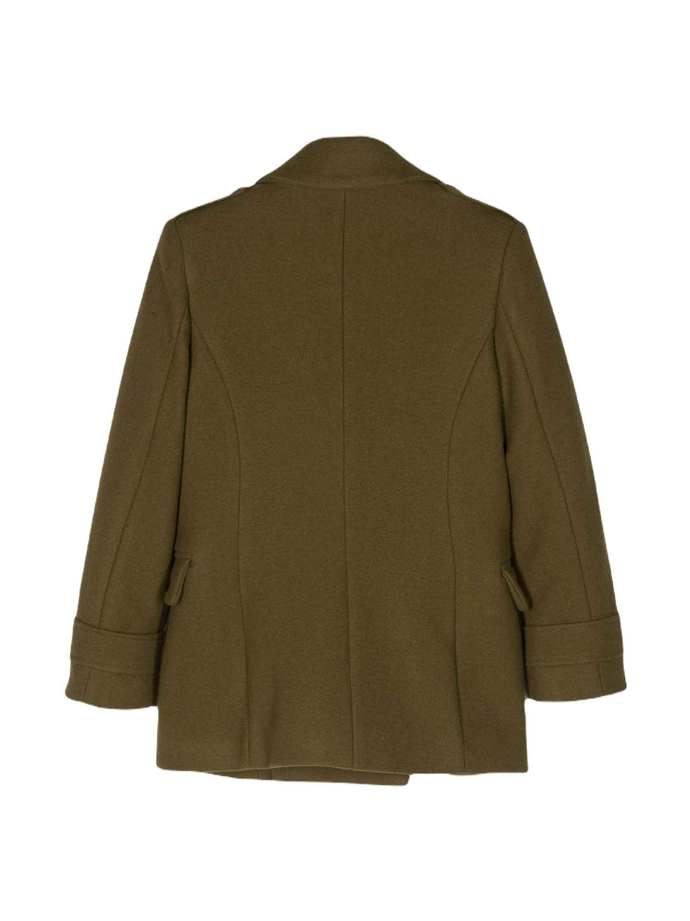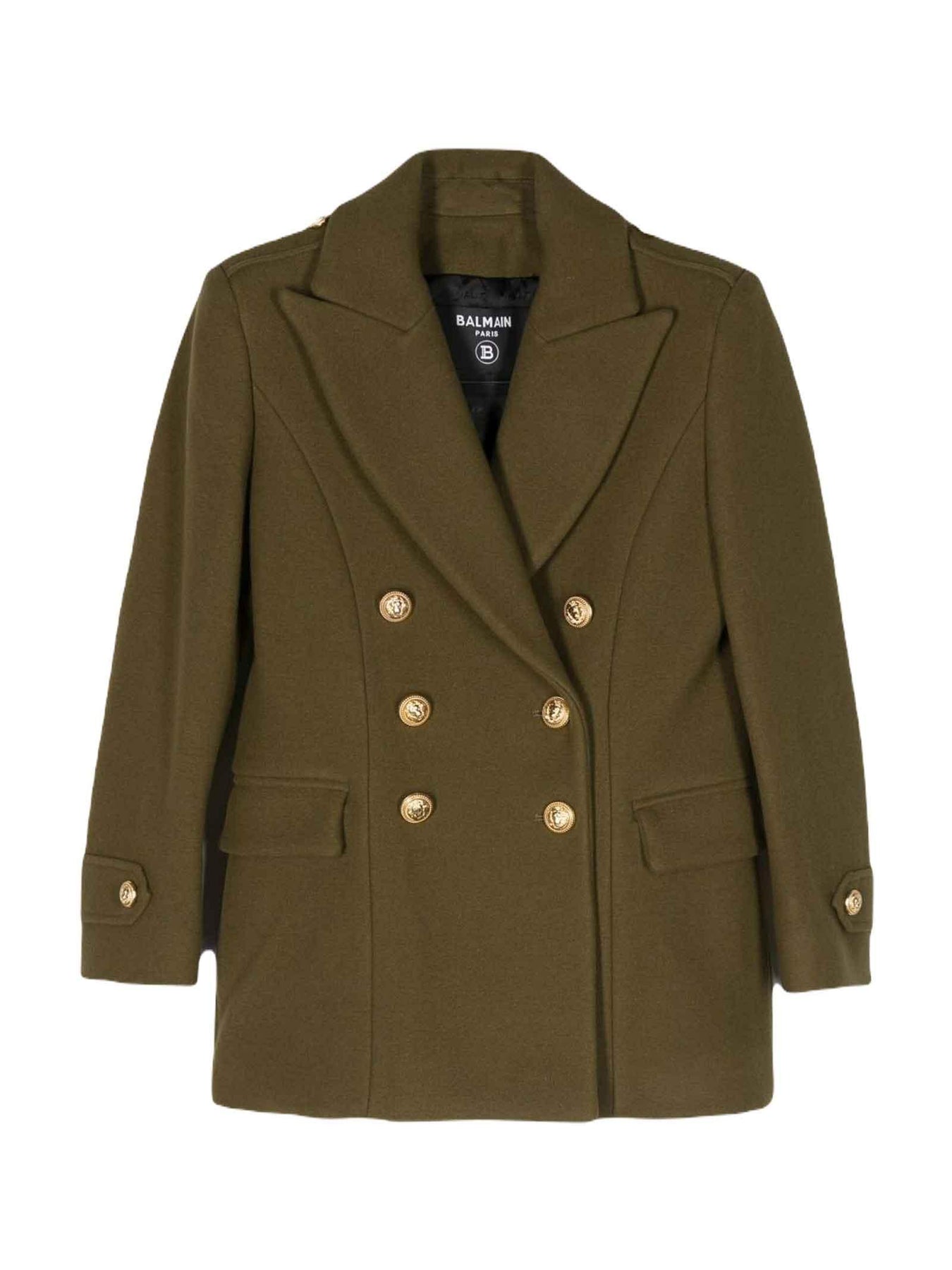 Cappotto verde bambina Balmain Kids. Revers a punta, chiusura doppiopetto con bottoni, maniche lunghe, orli con cintura, due tasche laterali con patta, doppio spacco posteriore e orlo dritto. Lana Vergine 80%, Poliammide 20