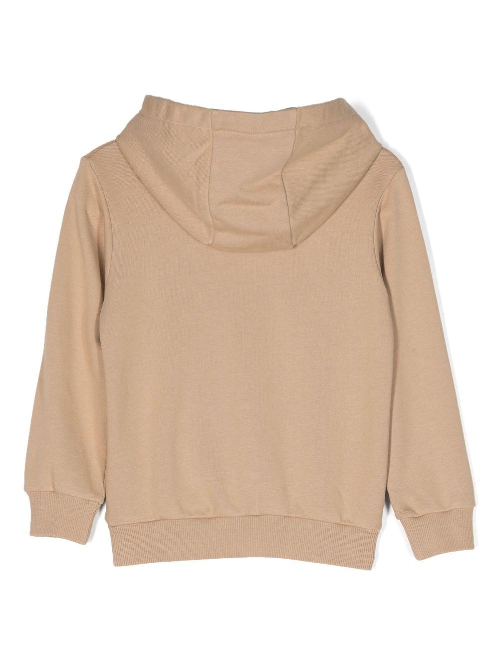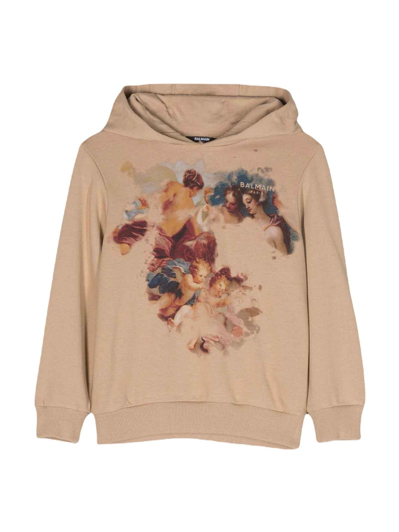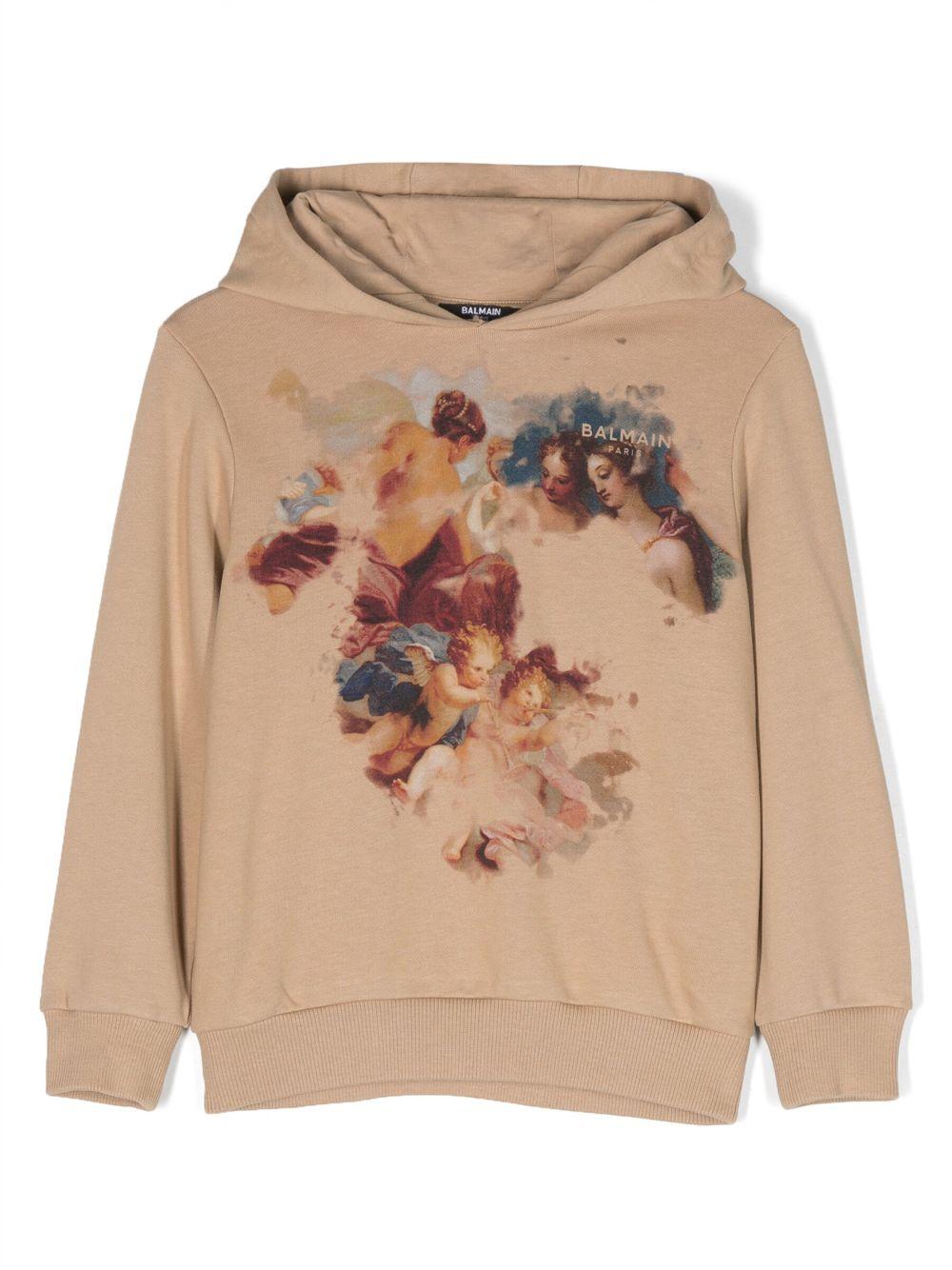 Felpa marrone bambino Balmain Kids. Stampa con logo sul petto, cappuccio con coulisse e maniche lunghe. Cotone 100%