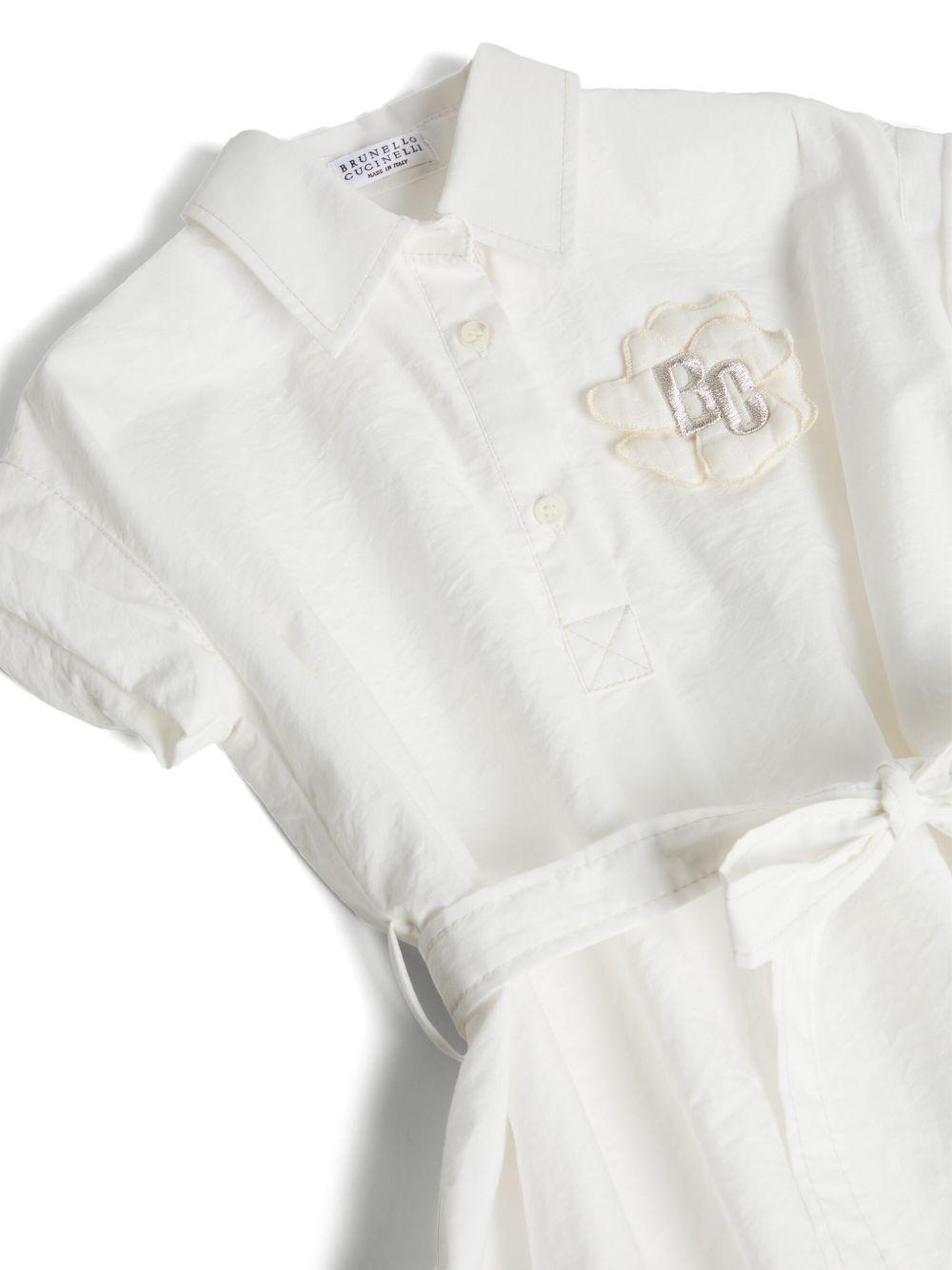 Abito BRUNELLO CUCINELLI KIDS.Bianco,falsatura frontale con abbottonatura,maniche corte,modello con cintura,orlo asimmetrico.cotone 75%, nylon 25%