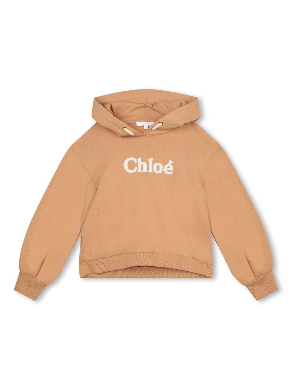 Felpa beige bambina Chloé Kids. Maniche lunghe, cappuccio e ricamo frontale. Cotone Biologico 100%