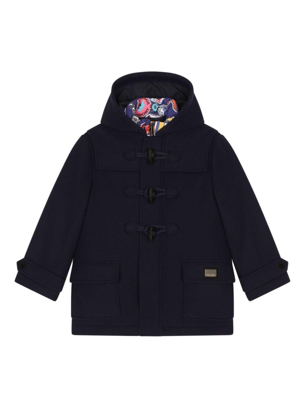 Cappotto blu bambino Dolce & Gabbana Kids. placca con logo color argento, cappuccio, chiusura frontale con alamari, maniche lunghe, due tasche applicate frontali e orlo dritto. lana vergine 75%, nylon 25%
