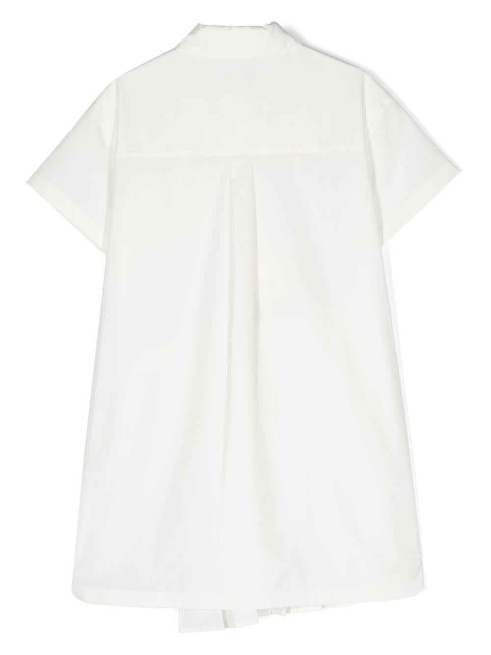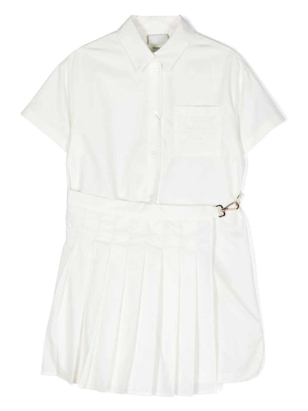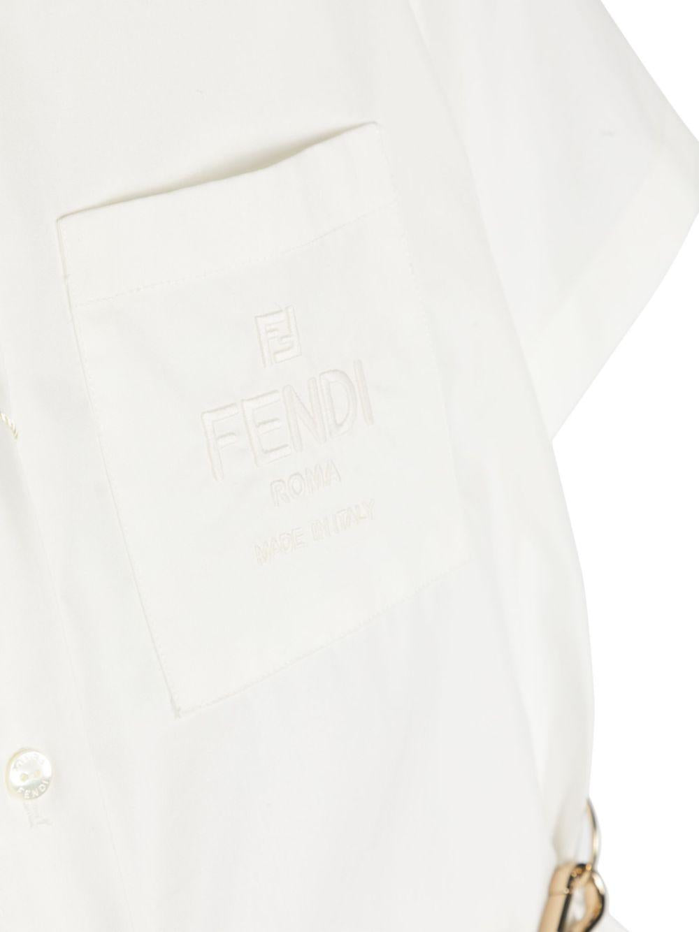 Abito bianco bambina Fendi kids. Maniche corte, colletto classico, chiusura con bottoni, tasca sul petto, logo ricamato e design plissettato. Lino 100%