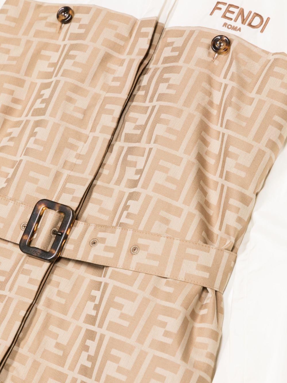Abito bianco/beige bambina Fendi Kids. Logo ricamato sul petto, stampa logo FF, due tasche sul petto con chiusura a bottoni, due tasche laterali inserite, bianco, marrone cammello, cotone, cintura in vita, colletto classico, davanti chiusura con bottoni e maniche lunghe.