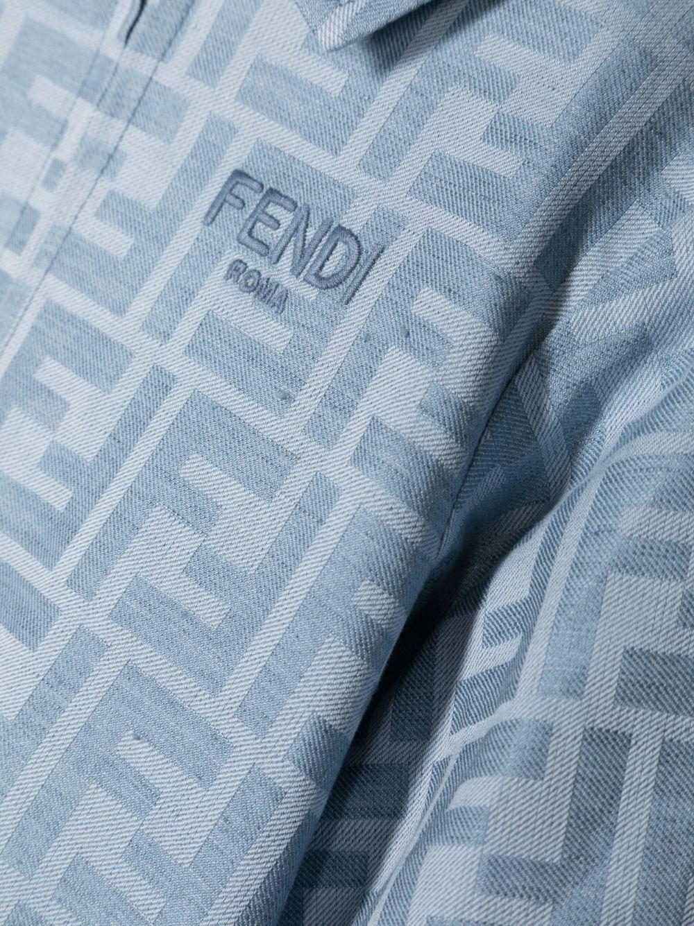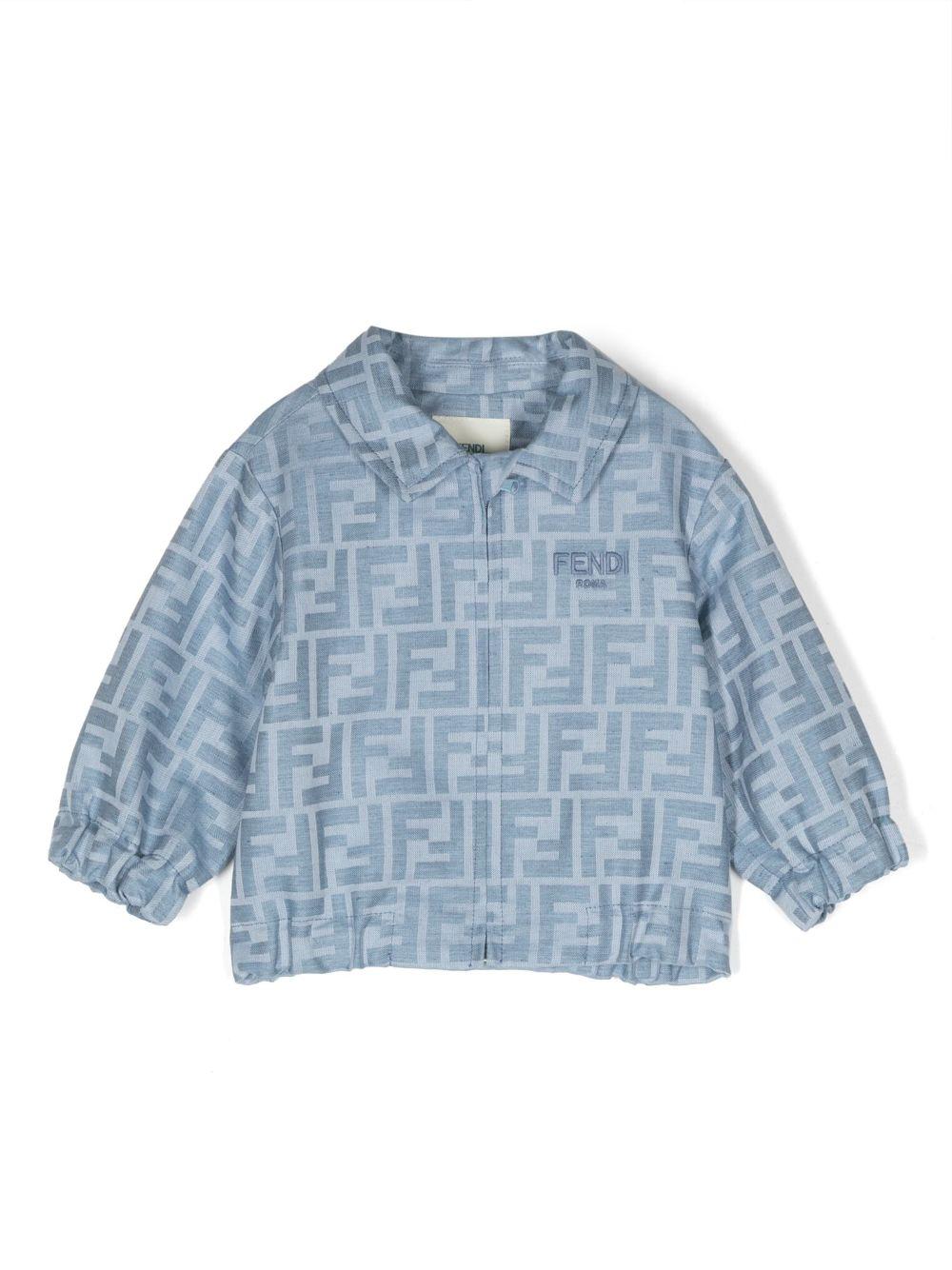 Bomber blu neonato Fendi Kids. Motivo logo jacquard, ricamo logo FF, colletto classico, chiusura frontale con zip nascosta, maniche lunghe, polsini elasticizzati e orlo elasticizzato. Cotone 50% Lino 50%
