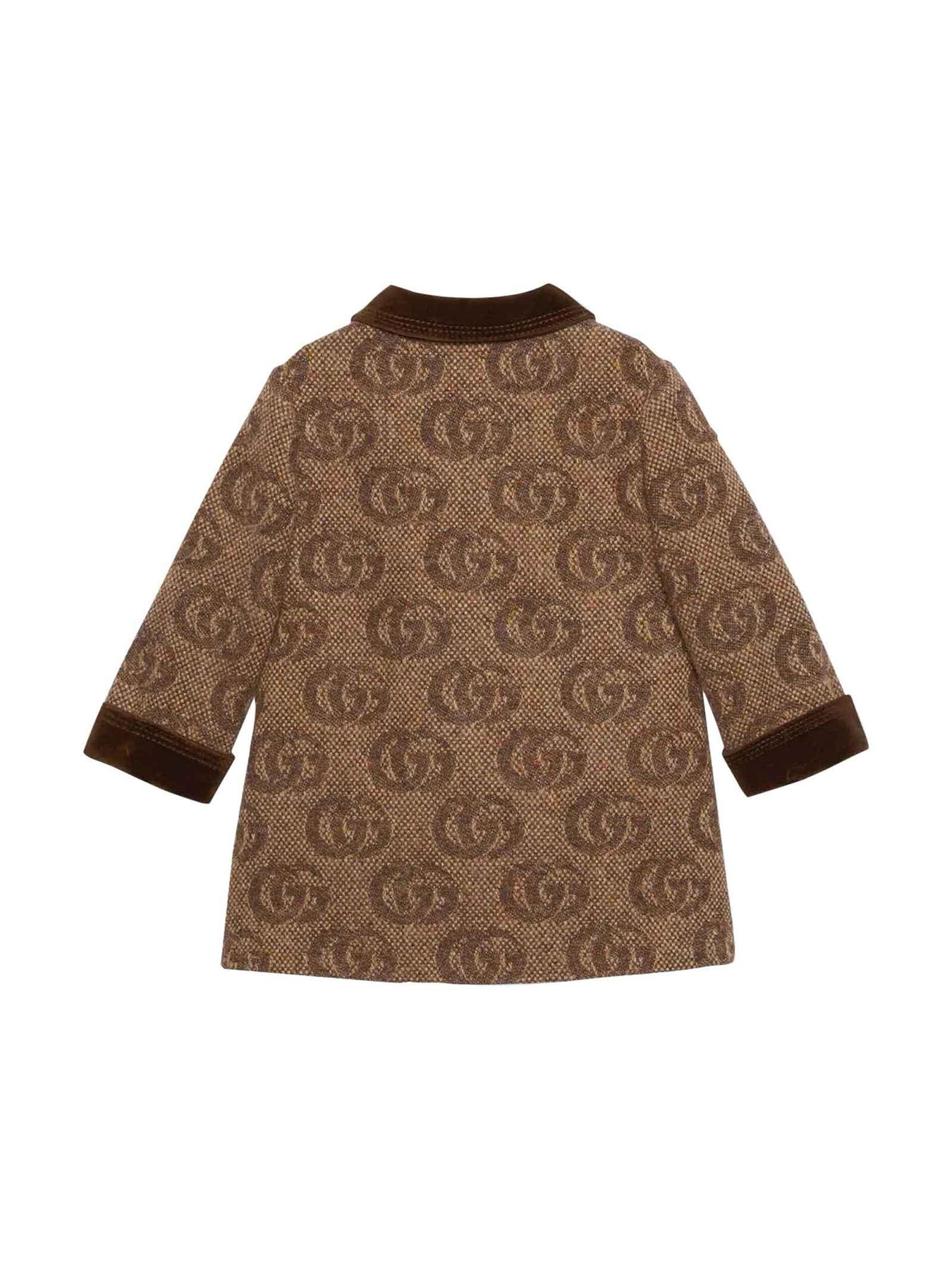 Cappotto marrone neonata Gucci Kids. Colletto Peter Pan, maniche lunghe e chiusura doppiopetto con bottoni. Cotone 98%, Lana 84%, Poliammide 16%, Spandex/Elastam 2%