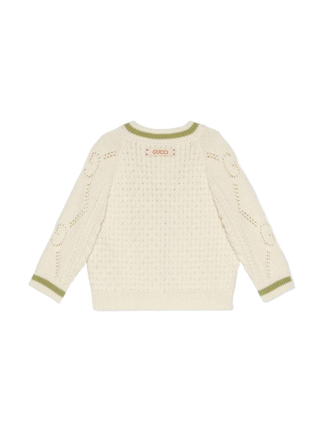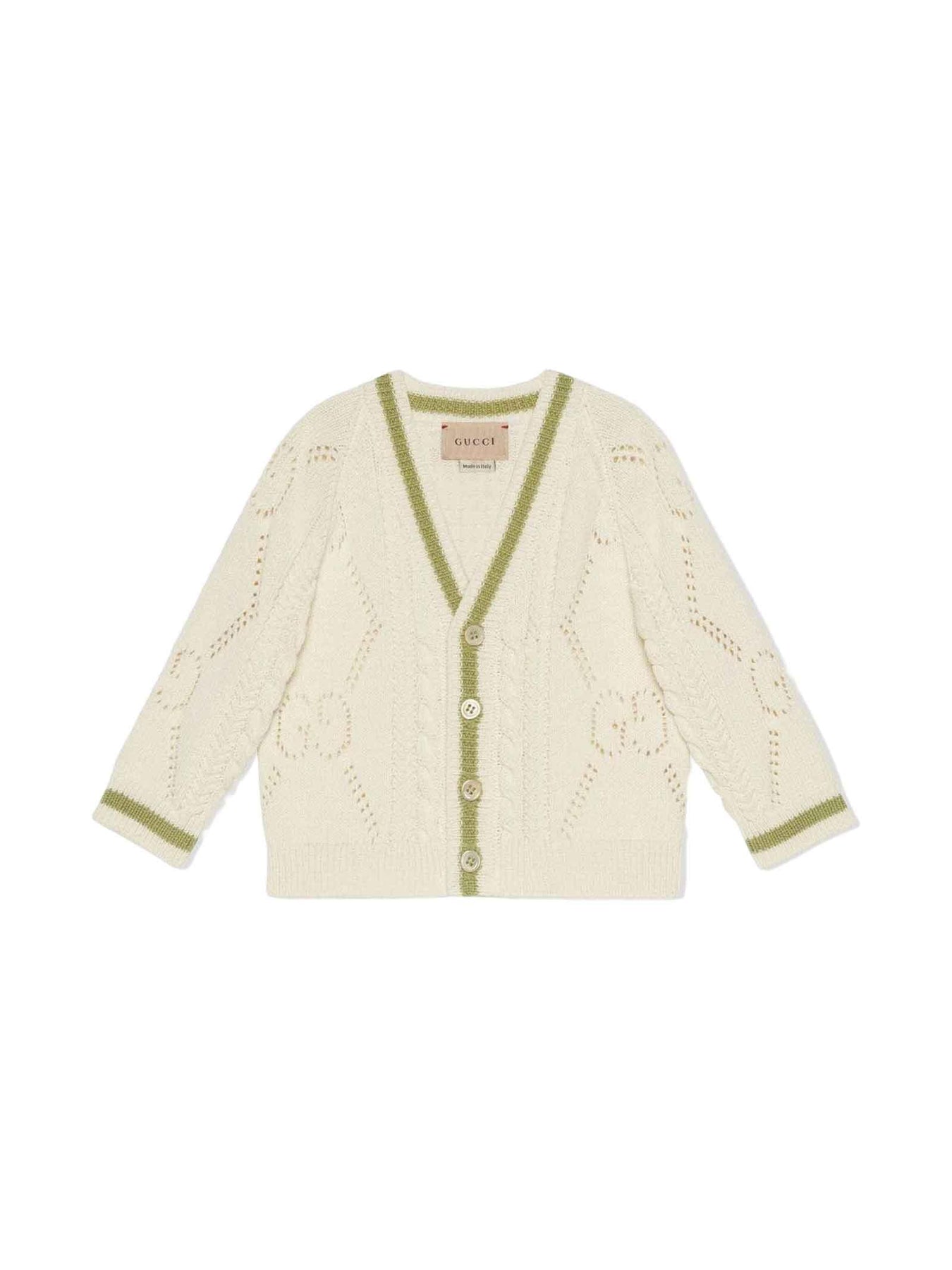 Cardigan bianco neonato Gucci kids. Dettaglio con logo traforato, scollo a V, bordo a righe, chiusura frontale con bottoni, polsini elasticizzati e orlo elasticizzato. Cotone 100%