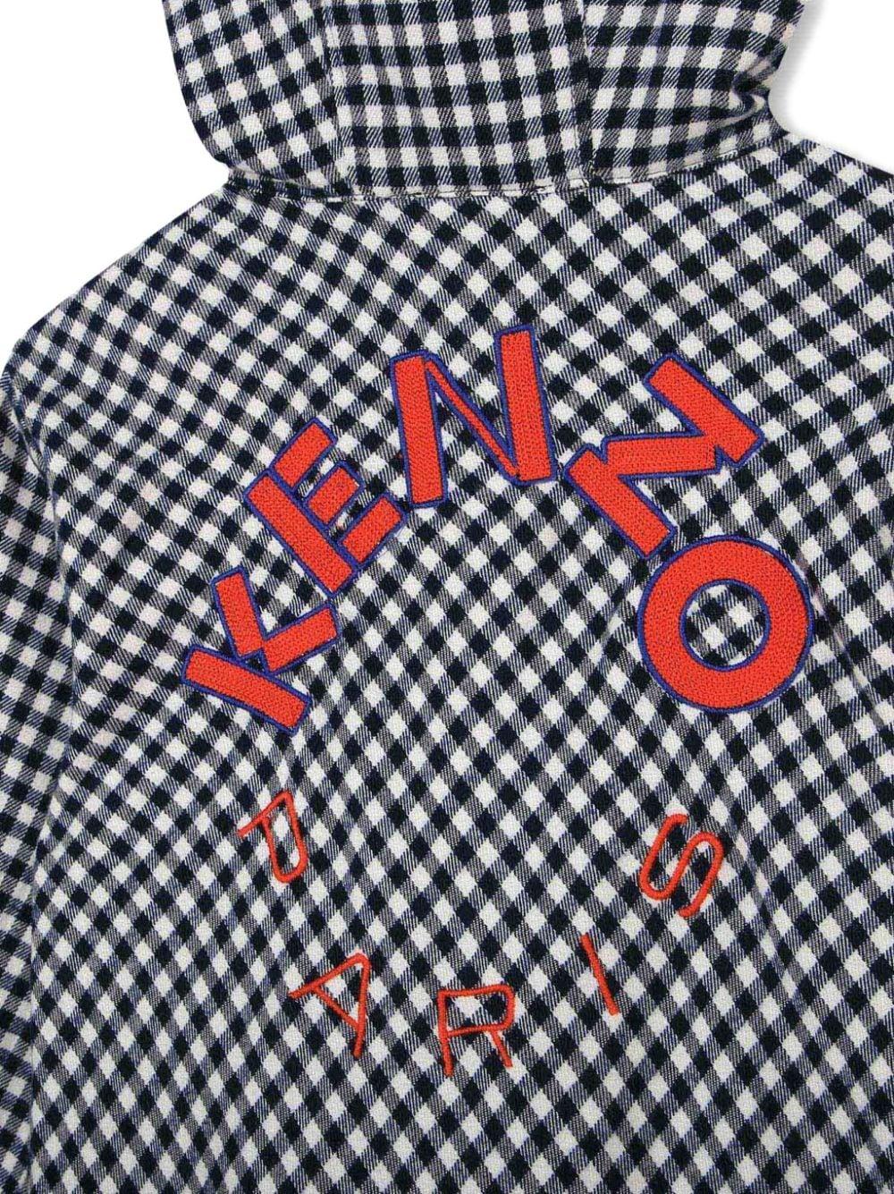 Abito blu bambina con logo Kenzo Kids. Motivo a quadri, applicazione frontale con logo, applicazione posteriore con logo, cappuccio, chiusura frontale con zip, maniche lunghe, vita con coulisse e orlo dritto. Cotone 100%, Viscosa 100%
