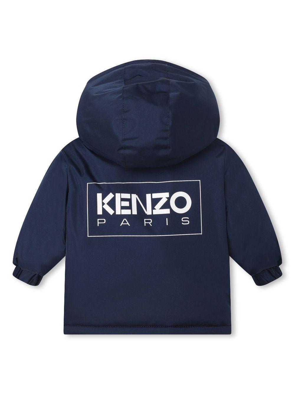 Giubbotto blu neonato Kenzo Kids. Stampa con logo sul petto, stampa con logo sul retro, cappuccio, colletto rialzato, chiusura frontale con zip, due tasche frontali a filetto, maniche lunghe, polsini elastici e orlo dritto.Composizione Poliestere 100%