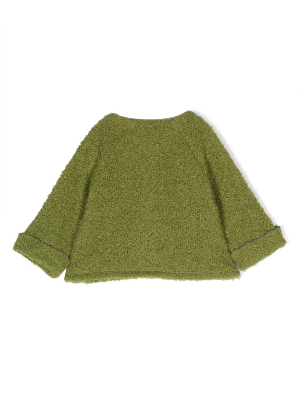 Giacca verde neonata La Stupenderia. design in pelliccia cruelty-free, dettaglio fiocco, scollo rotondo, chiusura frontale con bottoni, maniche lunghe e orli arrotolati. poliestere 100%