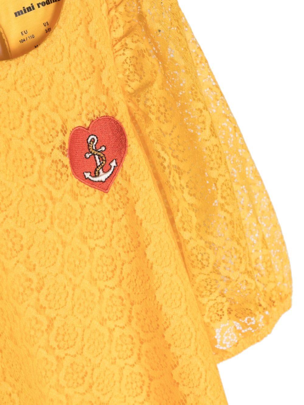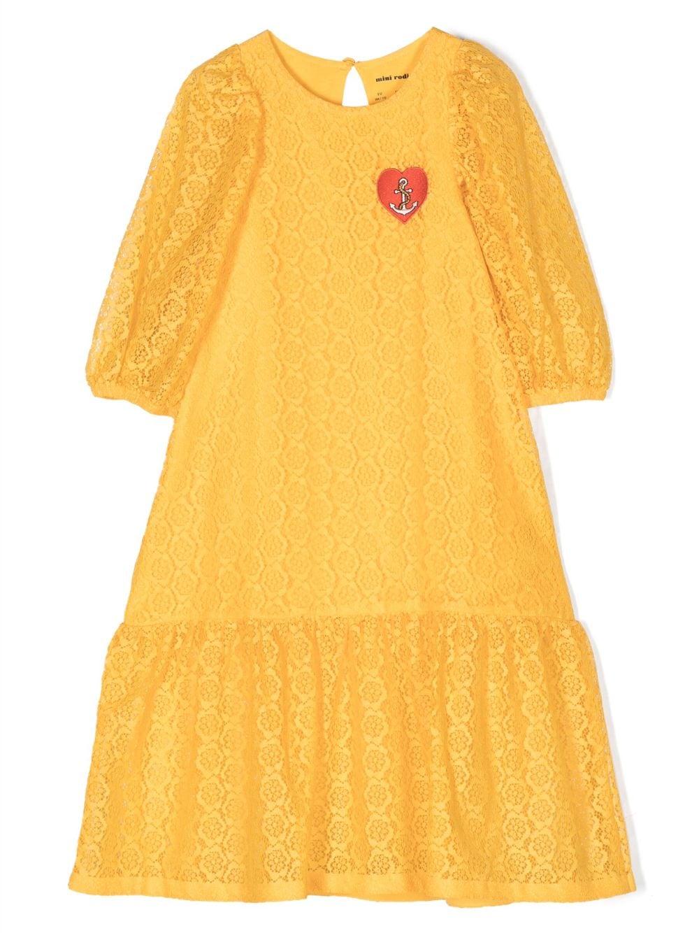 Abito con maniche a palloncino giallo bambina Mini Rodini.Giallo mostarda, dettaglio in pizzo a fiori, applicazione con cuore, scollo rotondo, chiusura posteriore con bottone singolo, maniche a palloncino, polsini elasticizzati e gonna con balze.Composizione: cotone biologico 62%, poliammide 38%