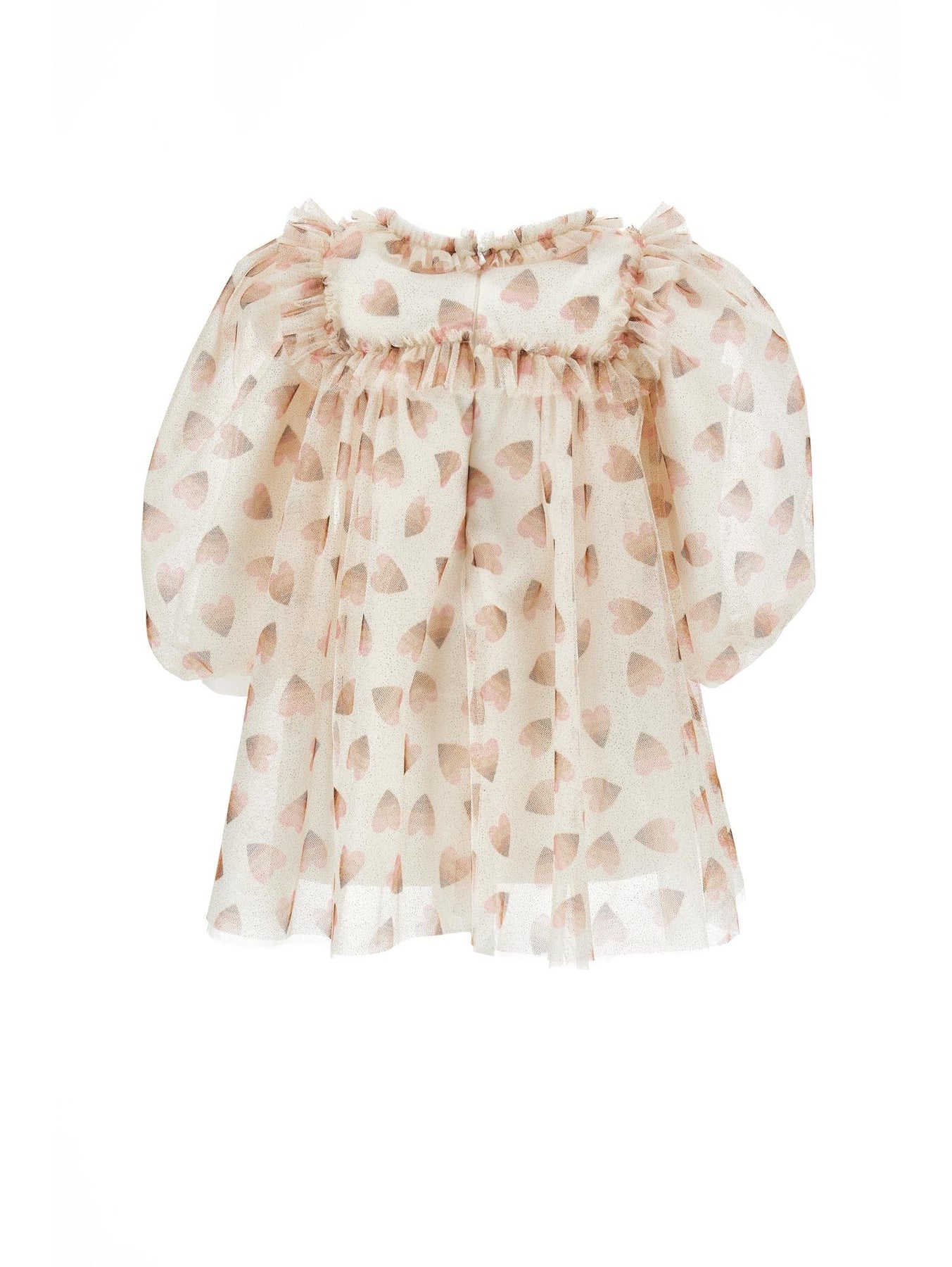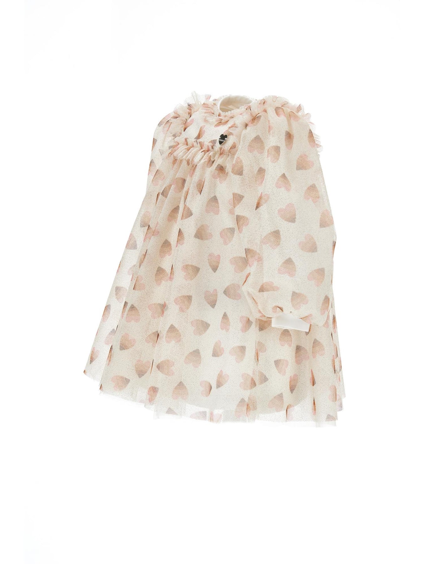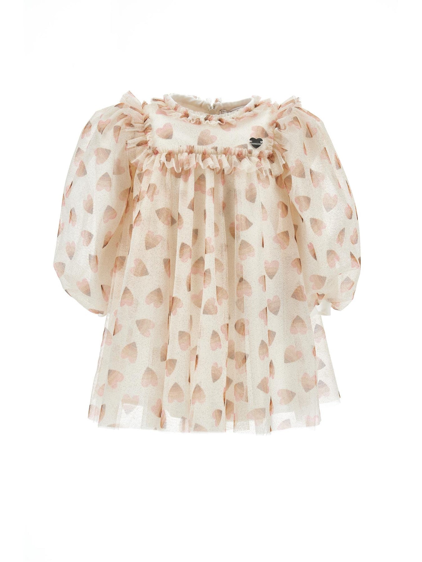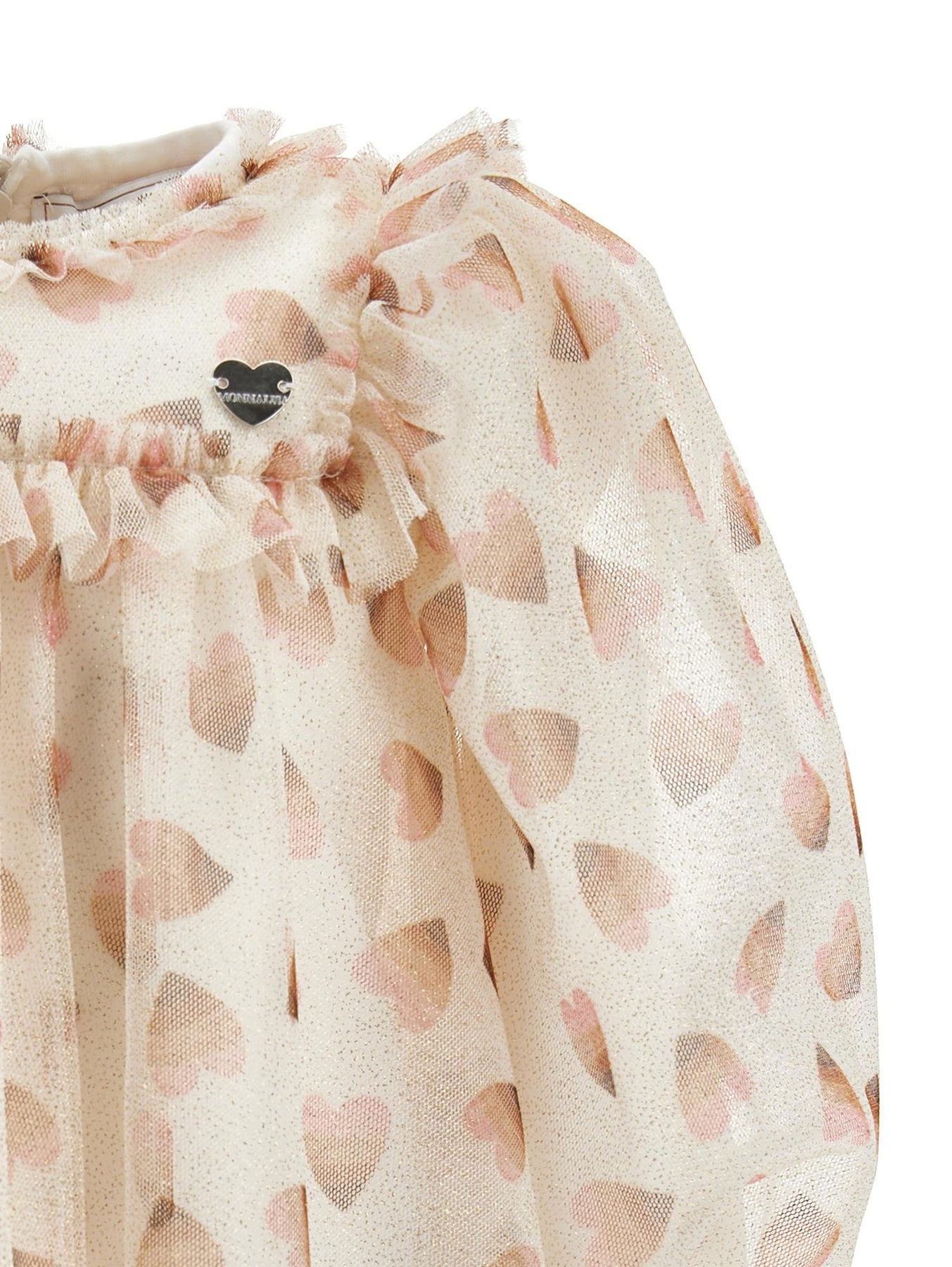 Abito beige neonata con stampa, Monnalisa kids, stampa grafica all-over, motivo a cuori, chiusura posteriore con zip, dettagli con ruches, scollo rotondo, maniche lunghe e orlo svasato.ComposizioneFodera: viscosa 60%, cotone 40%Esterno: poliestere 100%
