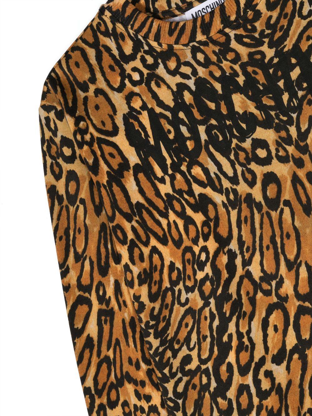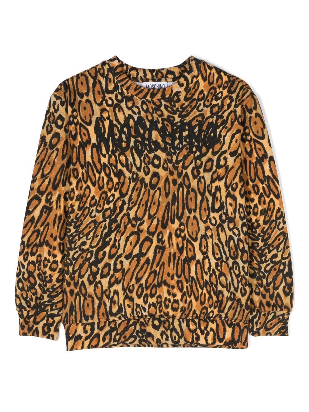 Felpa marrone bambino con stampa, Moschino Kids, stampa con logo sul davanti, stampa leopardo all-over, scollo rotondo e maniche lunghe. ComposizioneCotone 100%