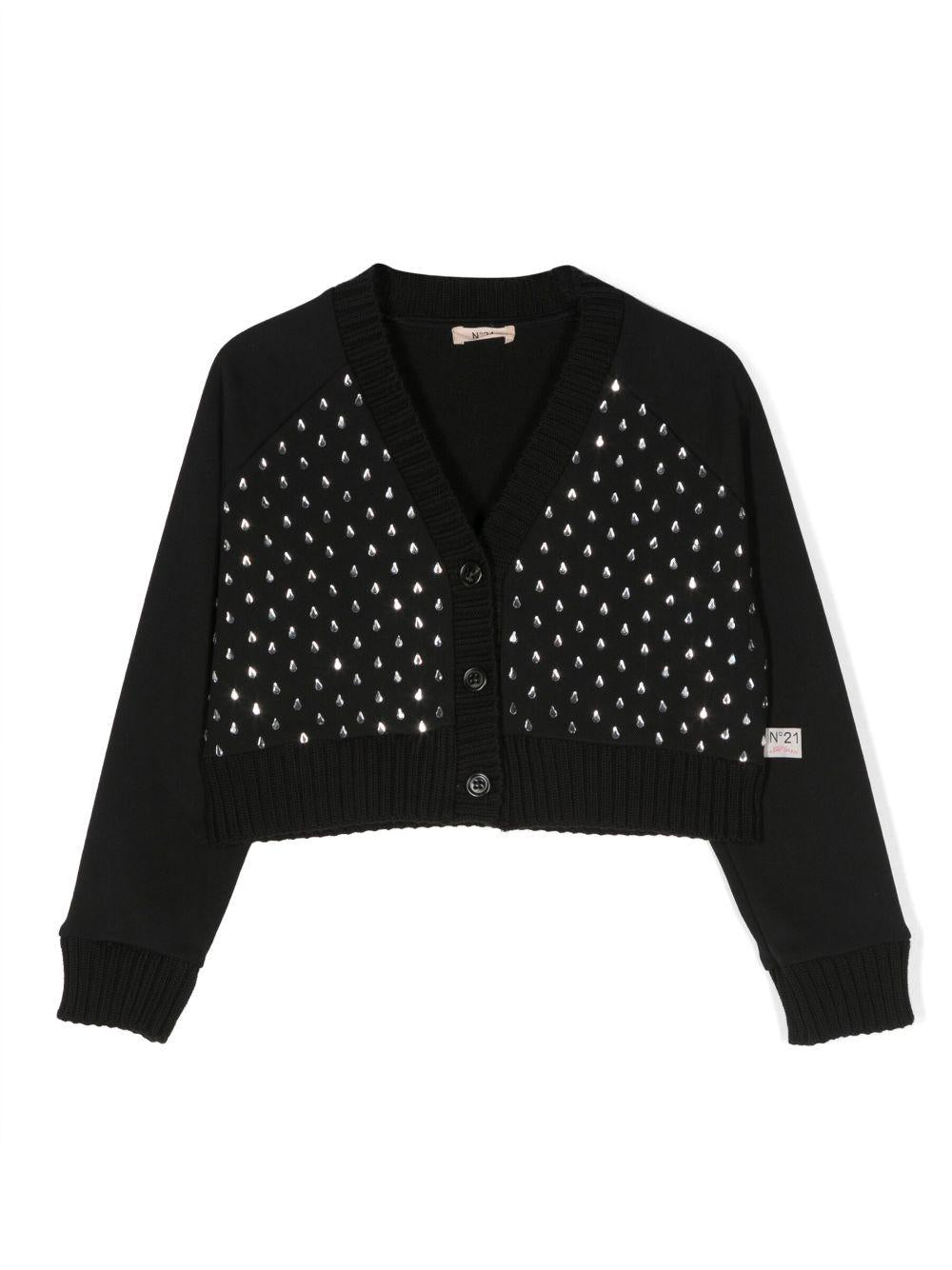 Nero, cotone, vetro, decorazione con cristalli, scollo a V, maniche lunghe, orlo dritto e chiusura frontale con bottoni.cotone 100%, vetro 100%