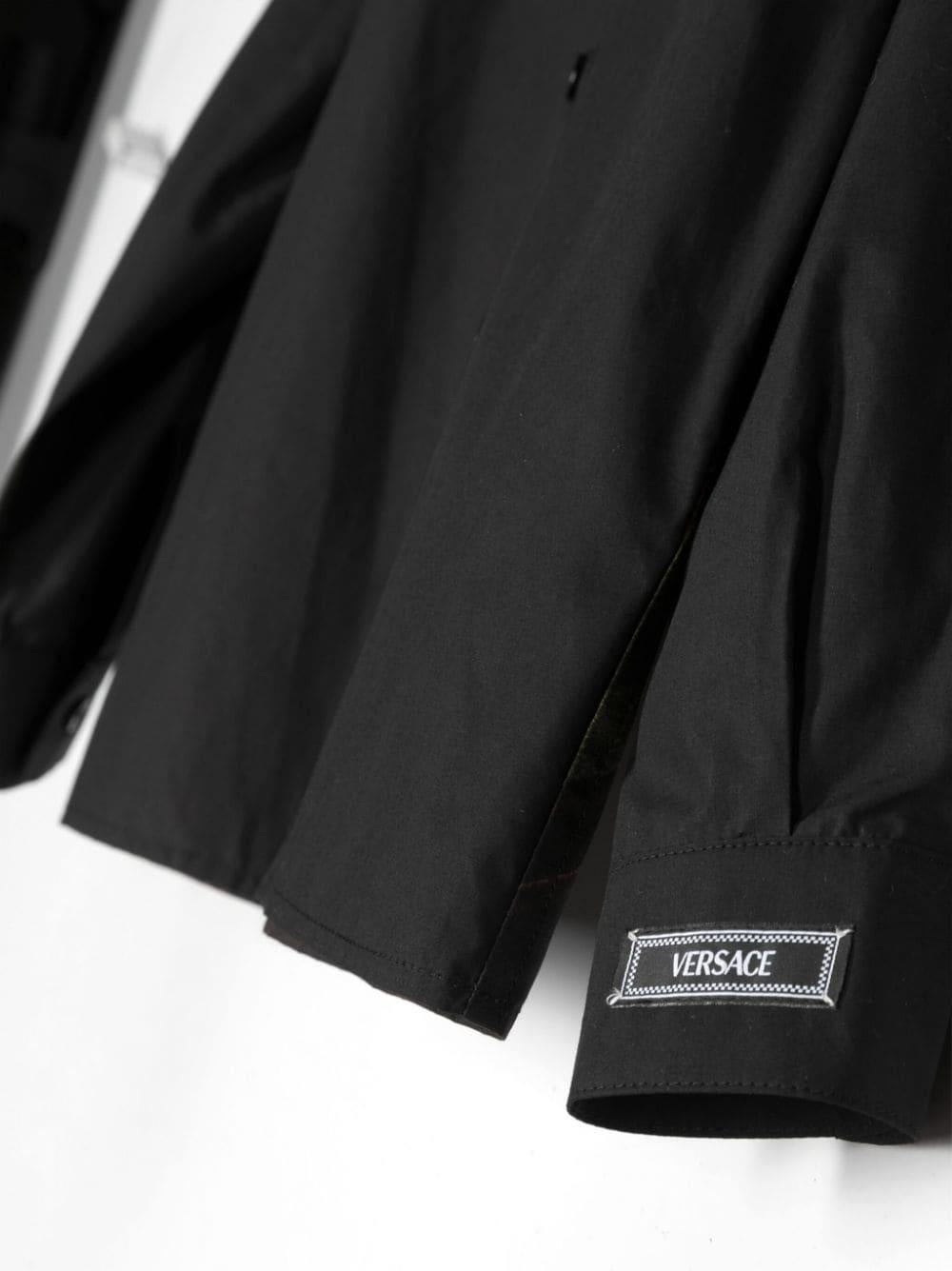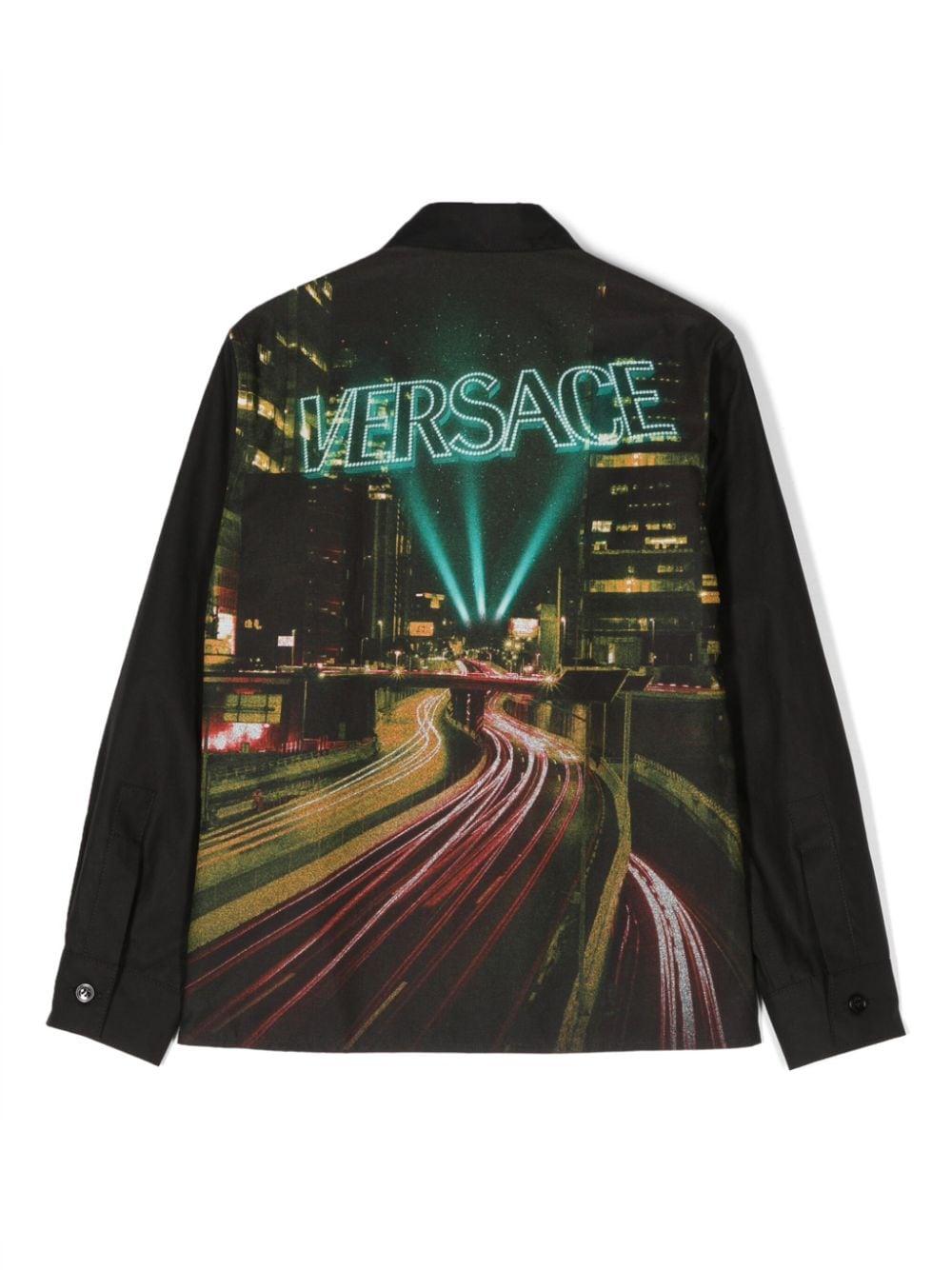 Camicia nera bambina con stampa posteriore, Versace kids, applicazione sulla manica con logo, colletto classico, chiusura frontale con bottoni, tasca applicata sul petto, maniche lunghe, orli con bottone e orlo dritto.ComposizioneCotone 100%