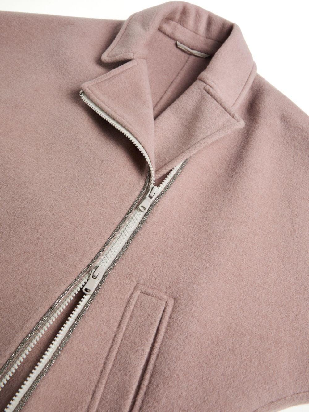 Giacca biker rosa bambina Brunello Cucinelli Kids. Colletto alla francese, chiusura decentrata frontale, due tasche a filetto laterali, maniche lunghe e orlo dritto. lana vergine 90%, camere 10%