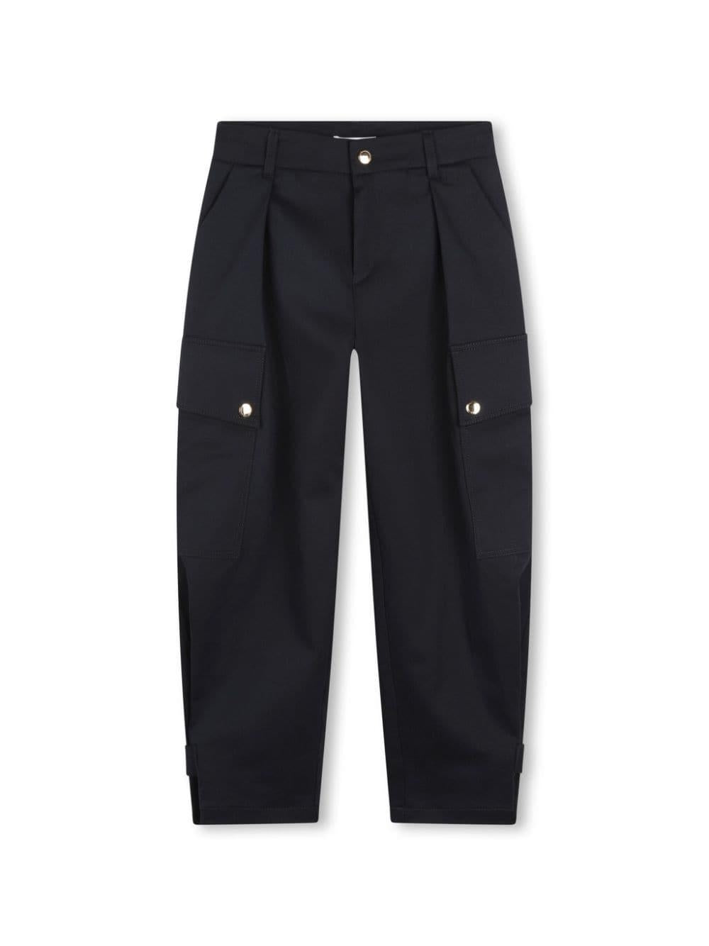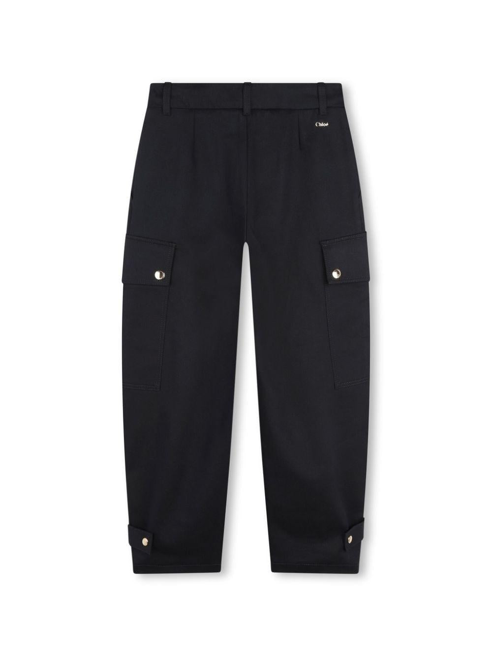 Pantaloni blu bambina Chloé Kids. Tessuto in twill, linguetta stringente sul fondo delle gambe, logo inciso, passanti, dettagli plissettati, due tasche laterali cargo e due tasche laterali a filetto. cotone 98%, elastam 2%