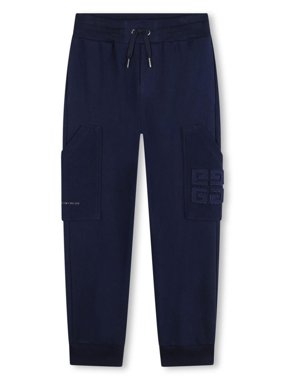 Pantaloni blu bambino Givenchy Kids. Caratteristico motivo 4G, vita con coulisse elasticizzata, due tasche laterali a filetto, gamba affusolata. cotone 85%, poliestere 15%