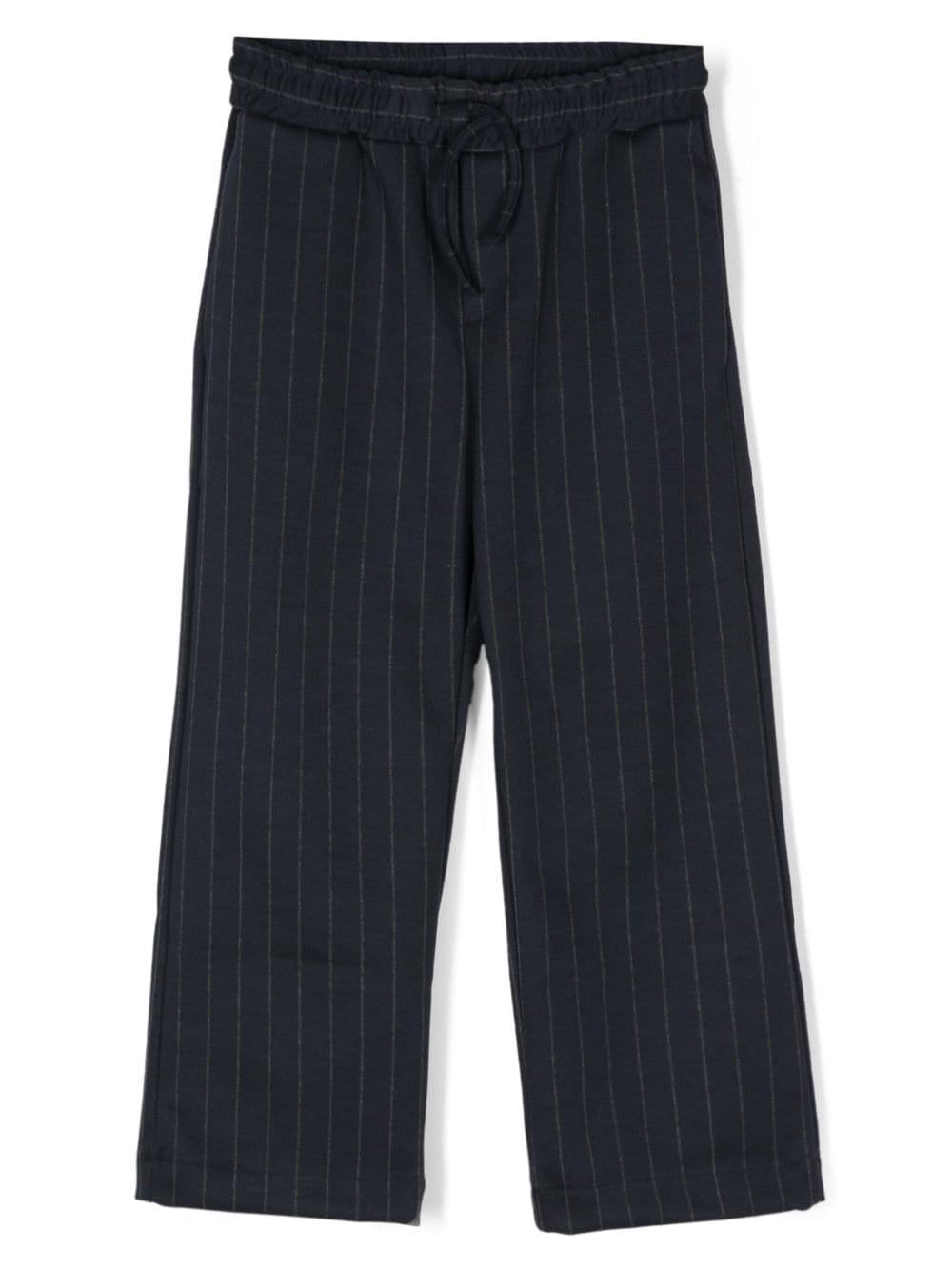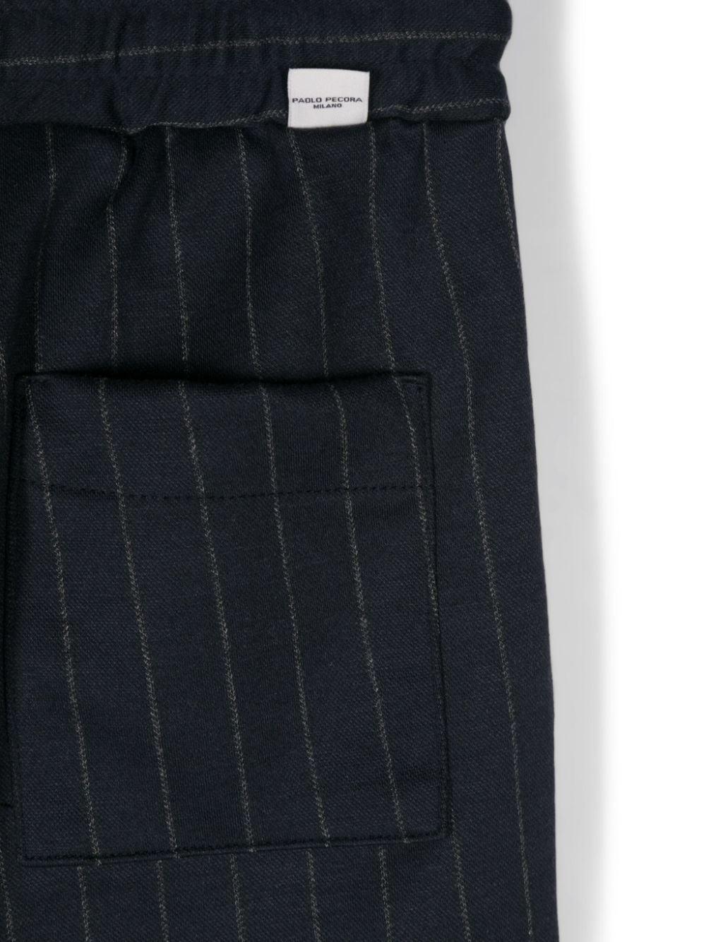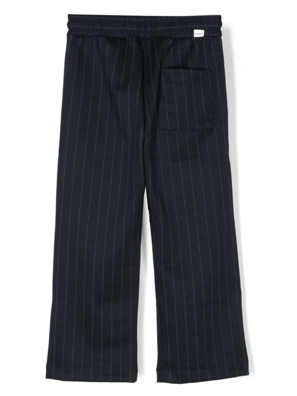 Pantaloni blu bambino Paolo Pecora Kids. Motivo gessato, vita elasticizzata con coulisse interna, due tasche laterali, mini targhetta con logo, tasca posteriore sagomata, taglio dritto. poliestere 79%, viscosa 16%, elastam 5%