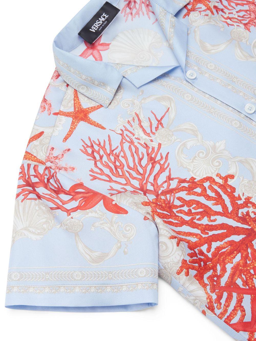 Camicia celeste/rosso corallo bambino Versace Kids. Stampa grafica all-over, caratteristica stampa Barocco, colletto alla cubana, chiusura frontale con abbottonatura, maniche corte e orlo dritto. seta 100%